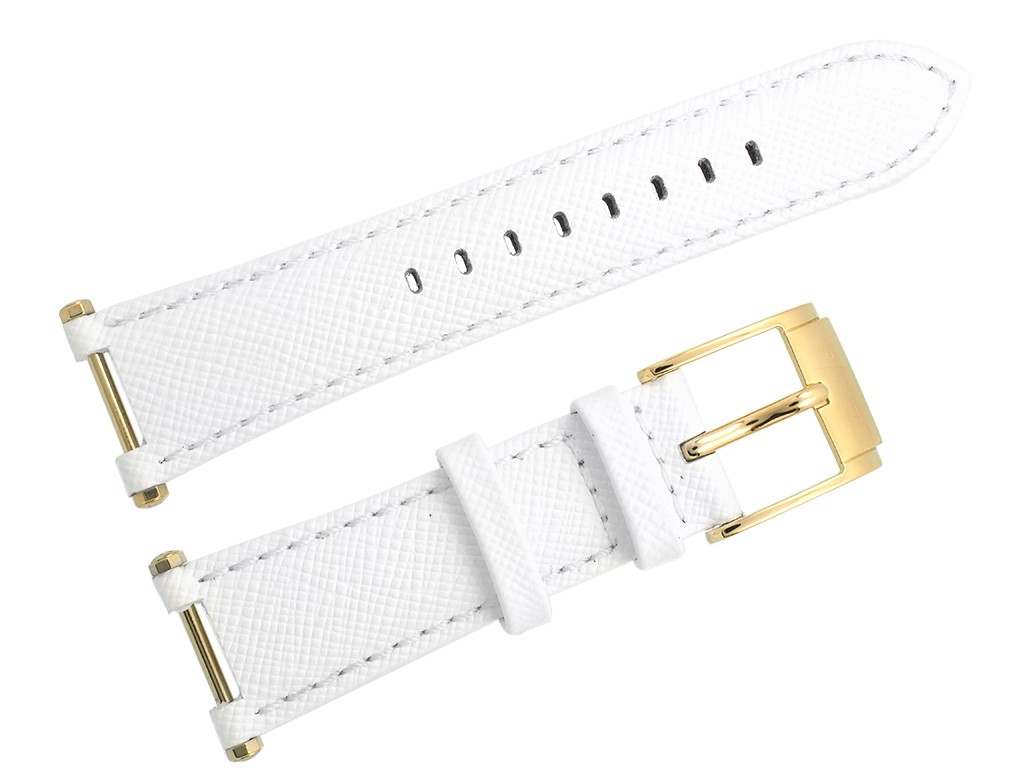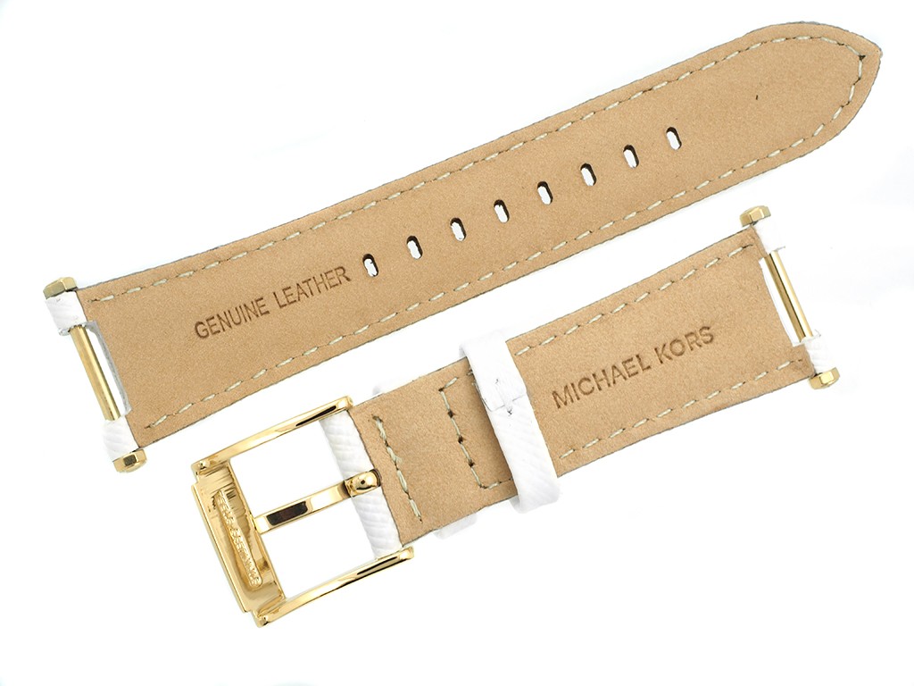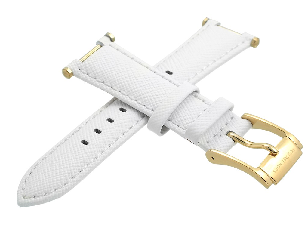 Oryginalny pasek do zegarka marki Michel Kors do modelu MK2391, wykonany ze skóry naturalnej w kolorze białym, na pasku tłoczony wzór, profilowany do koperty zegarka, sprzączka wykonana ze stali nierdzewnej w kolorze zlotym, z napisem Michael Kors.
