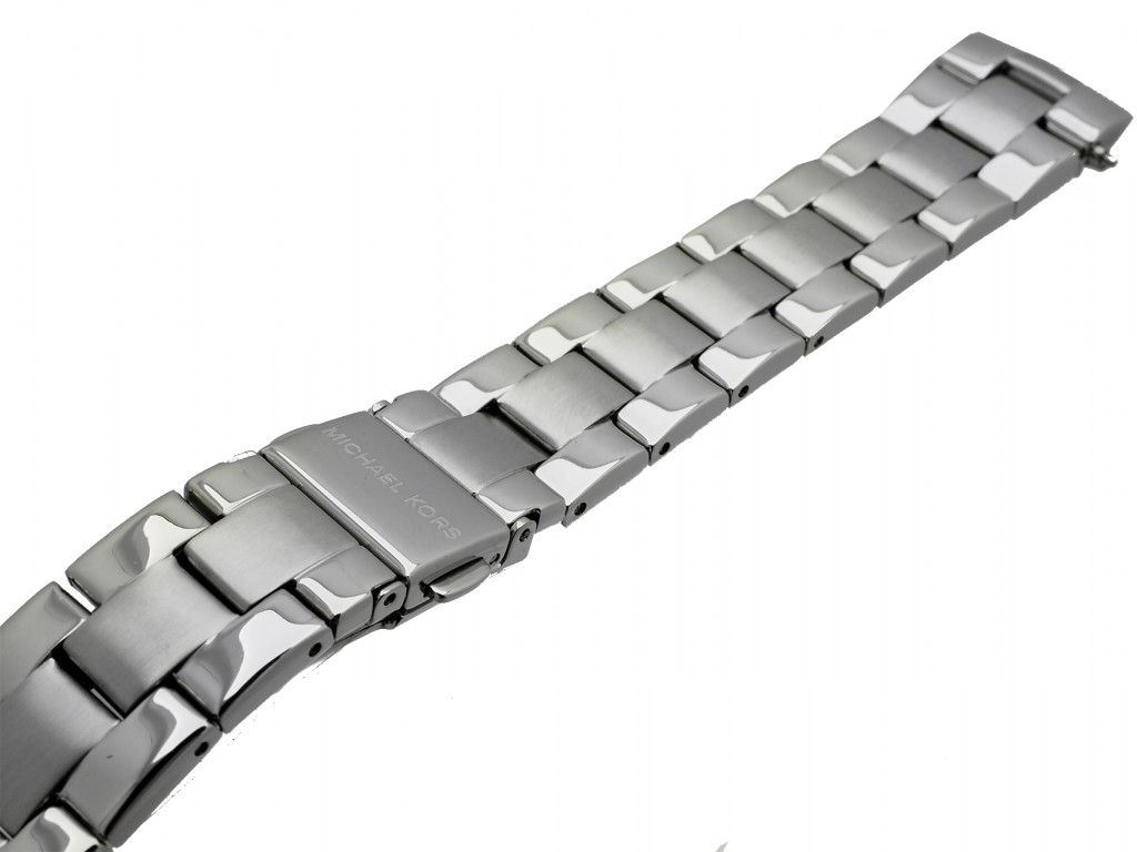 Oryginalna bransoleta do zegarka marki Michel Kors do modelu MKT5044 wykonana ze stali nierdzewnej w kolorze srebrnym, na zapięciu napis Michael Kors, z maskownicami.