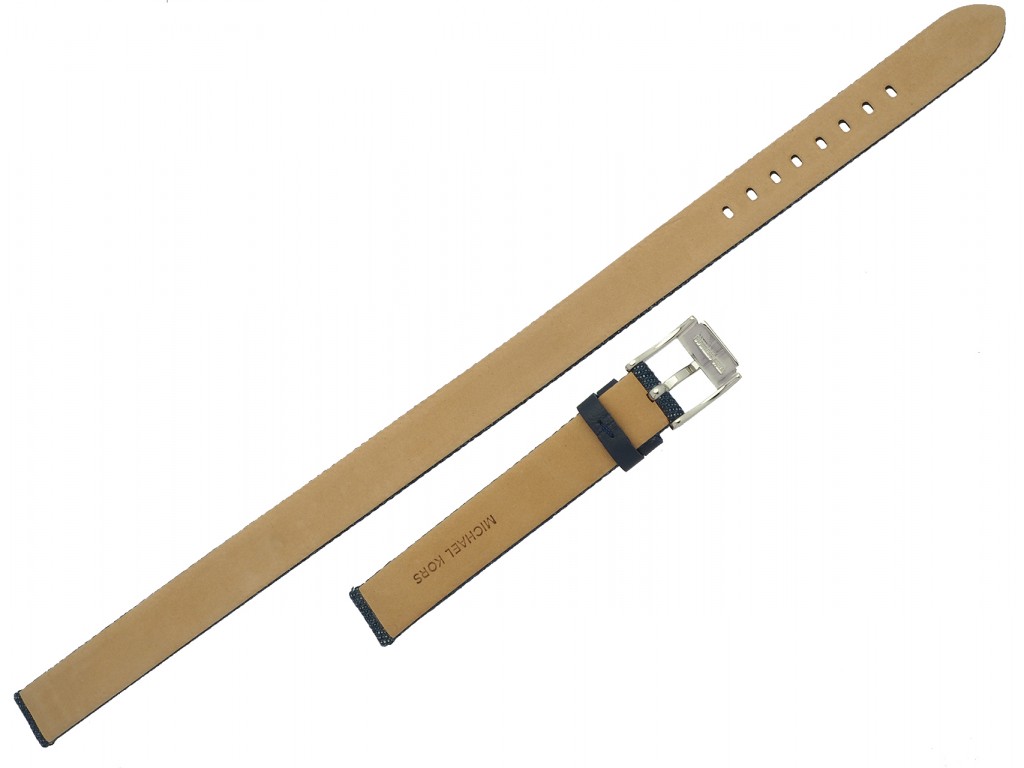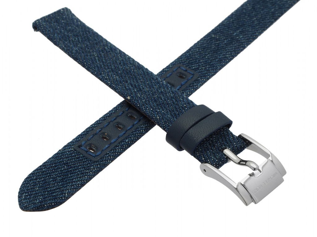 Oryginalny pasek do zegarka marki Michael Kors MK2655, wykonany z materiału wzór jeans, od spodu skóra naturalna, sprzączka wykonana ze stali nierdzewnej w kolorze srebrnym z napisem Michael Kors, pasek typu makaron, oplata dwa razy rękę.