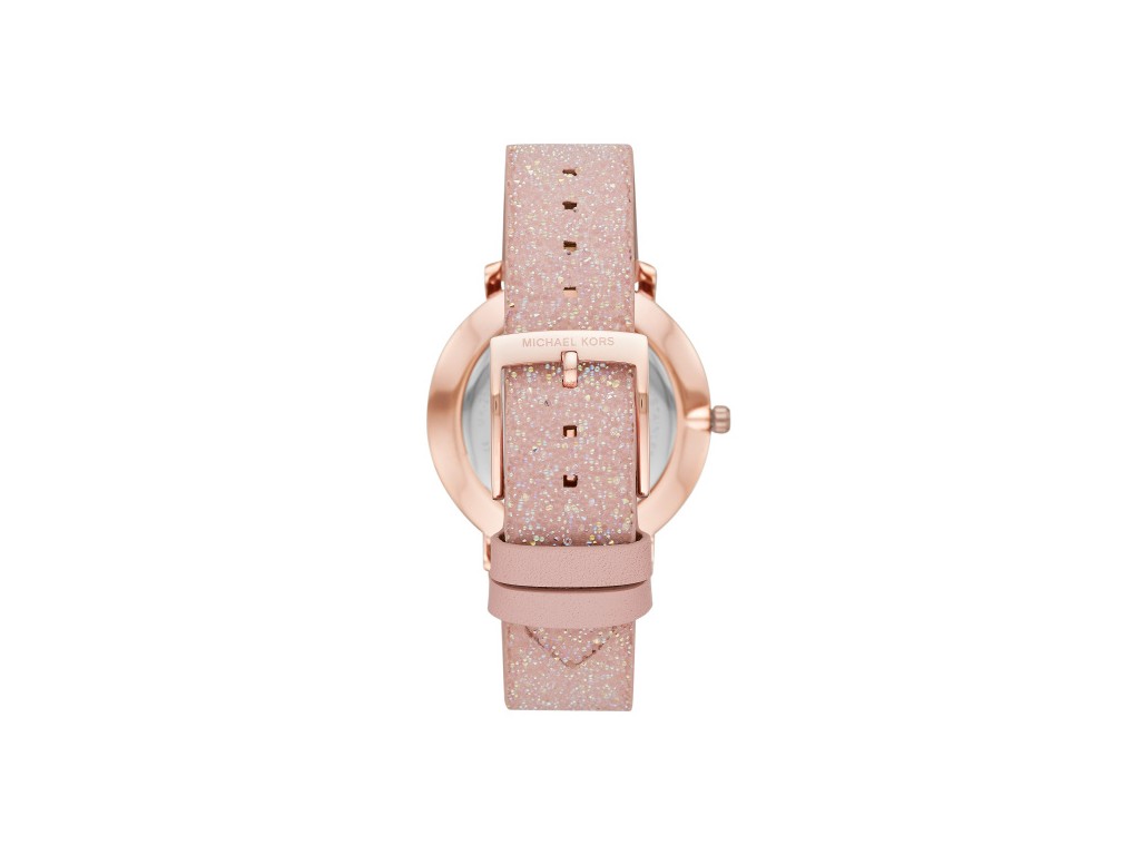 Oryginalny pasek do zegarka marki Michel Kors do modelu MK2884, wykonany ze skóry naturalnej w kolorze różowym, z brokatem, sprzączka wykonana ze stali nierdzewnej w kolorze złotym z napisem Michael Kors.