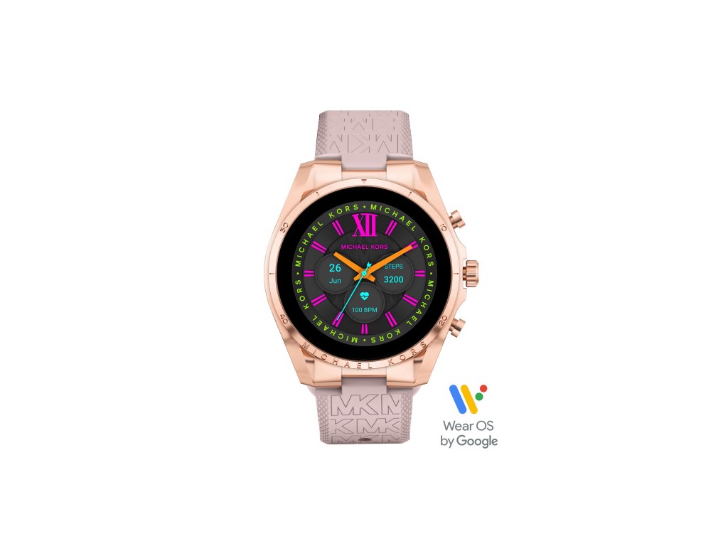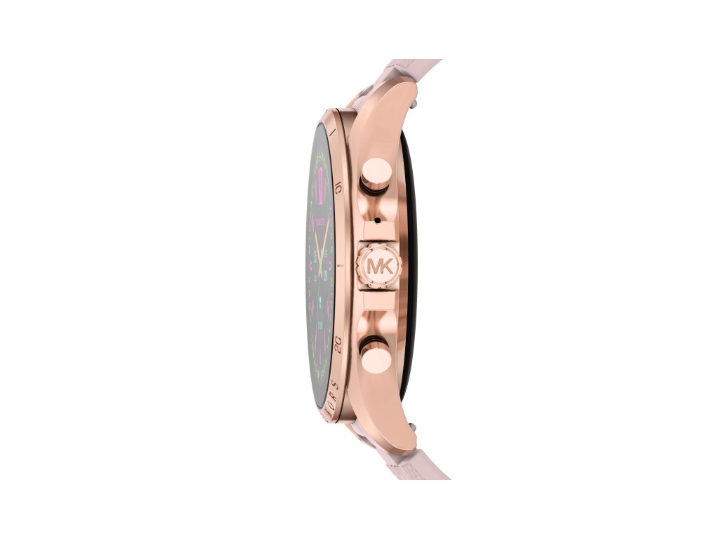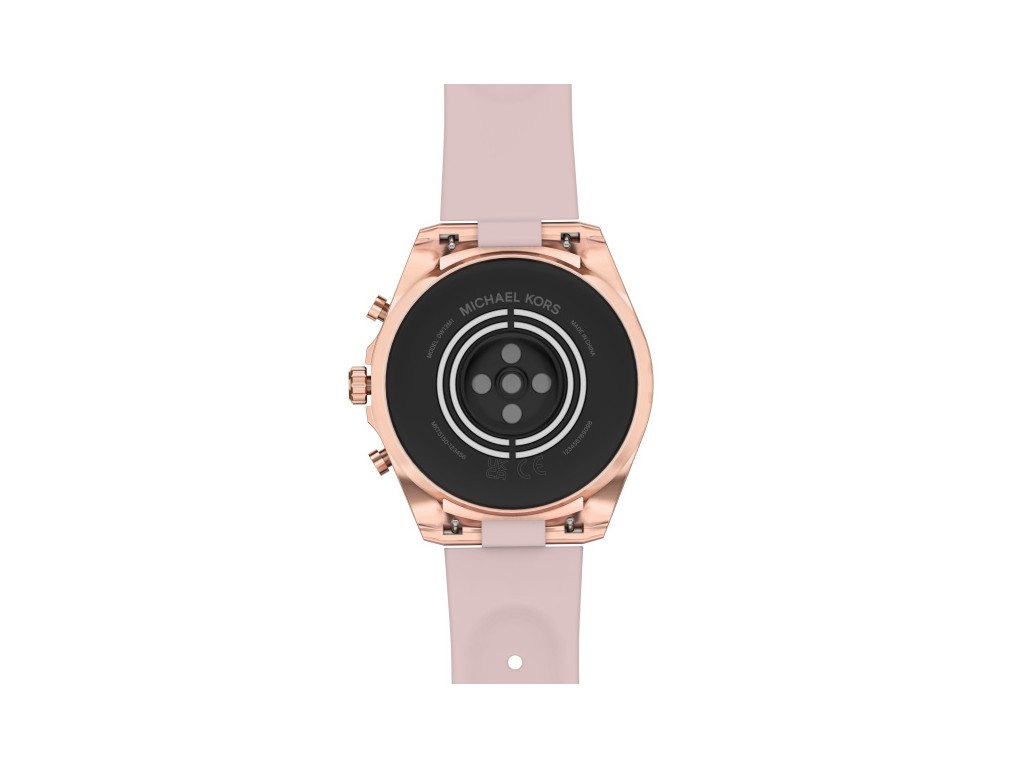 Oryginalny pasek do zegarka marki Michel Kors do modelu GEN 6 BRADSHAW MKT5150, wykonany z silikonu w kolorze różowym, na pasku tłoczone logo Michael Kors, elementy paska wykonane ze stali nierdzewnej w kolorze różowe złoto.