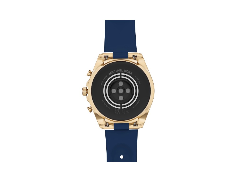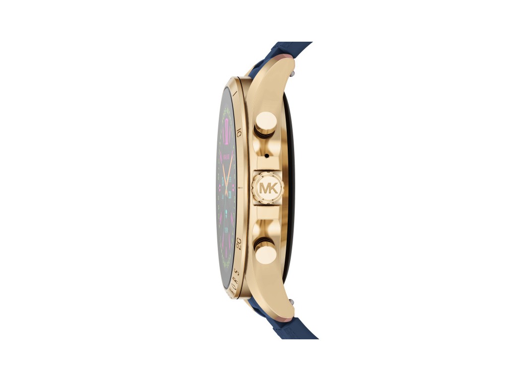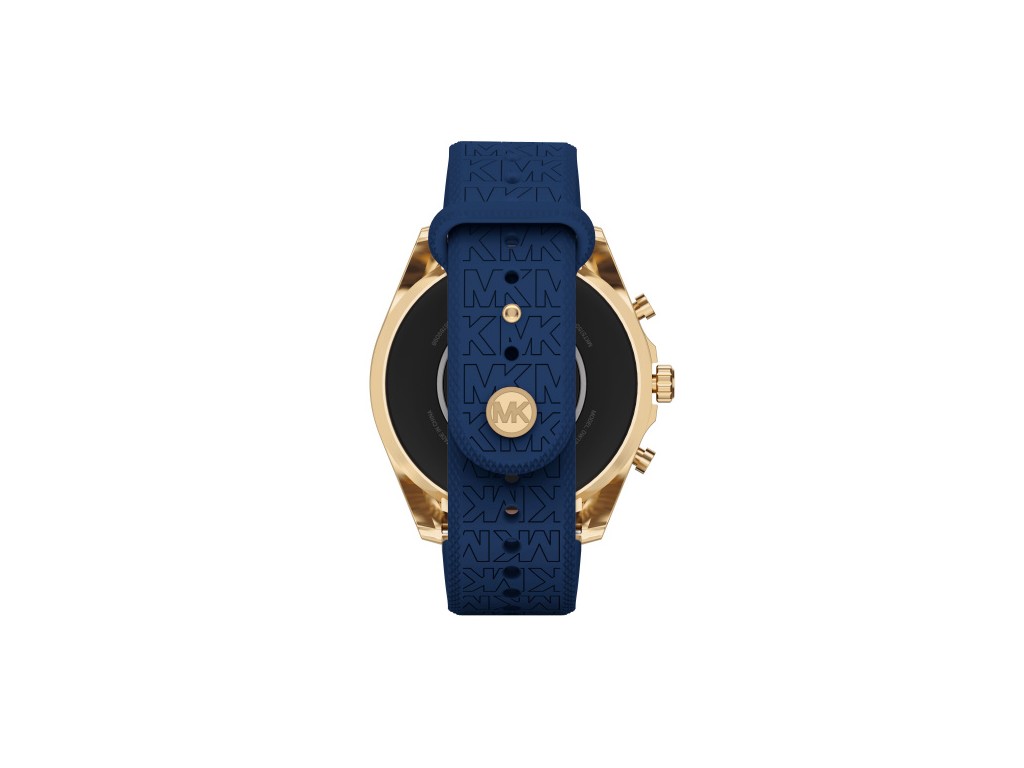 Oryginalny pasek do zegarka marki Michel Kors do modelu GEN 6 BRADSHAW MKT5152, wykonany z silikonu w kolorze granatowym, na pasku tłoczone logo Michael Kors, elementy paska wykonane ze stali nierdzewnej w kolorze złotym.