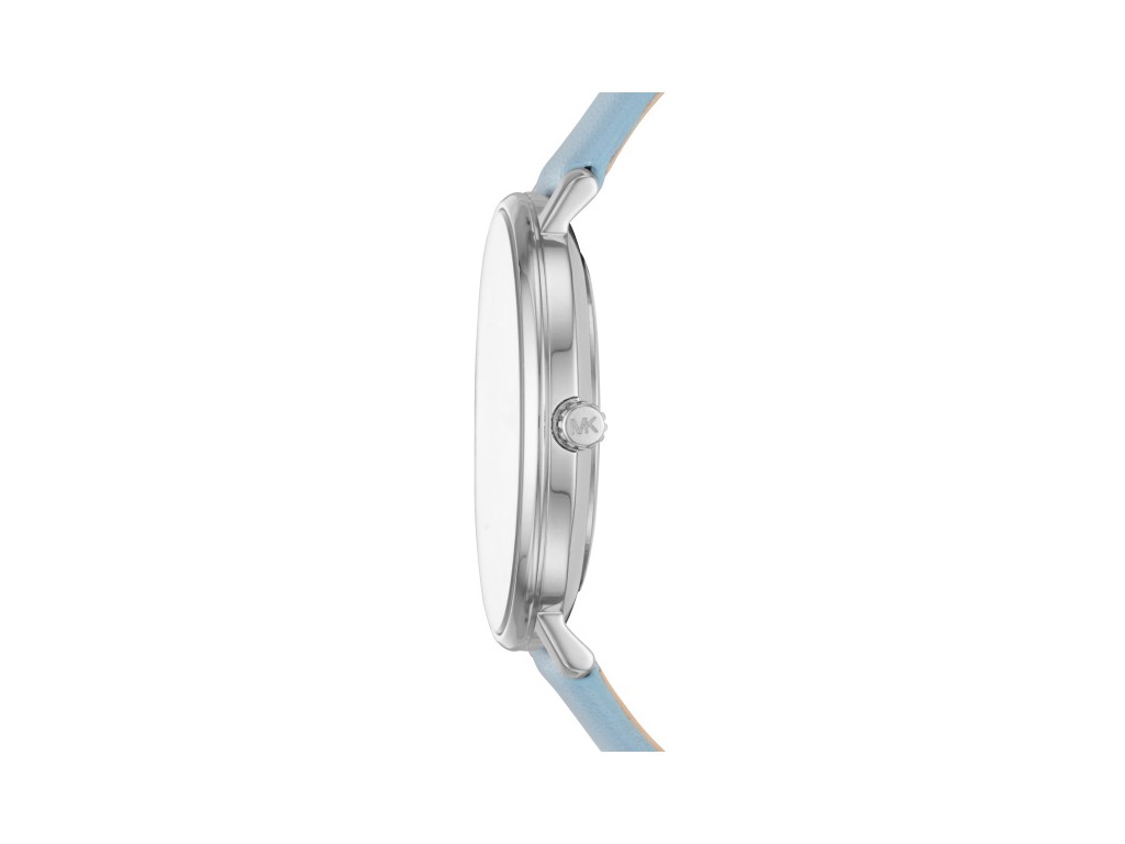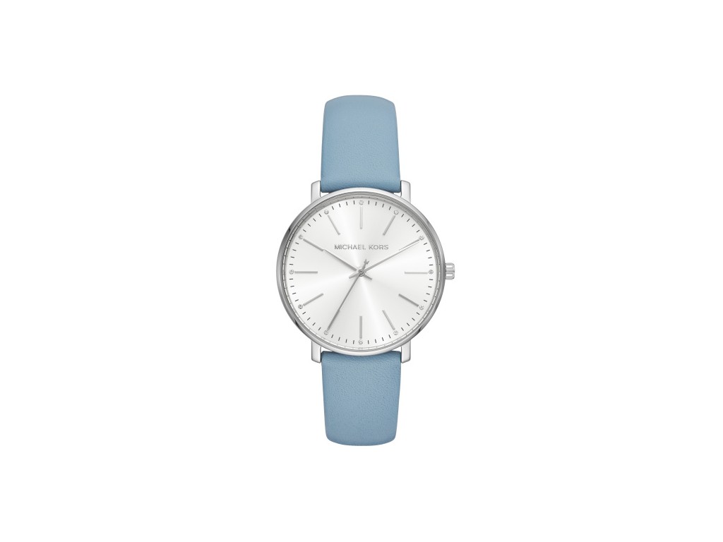 Oryginalny pasek do zegarka marki Michel Kors do modelu MK2739, wykonany ze skóry naturalnej w kolorze niebieskim BABY BLUE, gładki, sprzączka wykonana ze stali nierdzewnej w kolorze srebrnym z napisem Michael Kors.