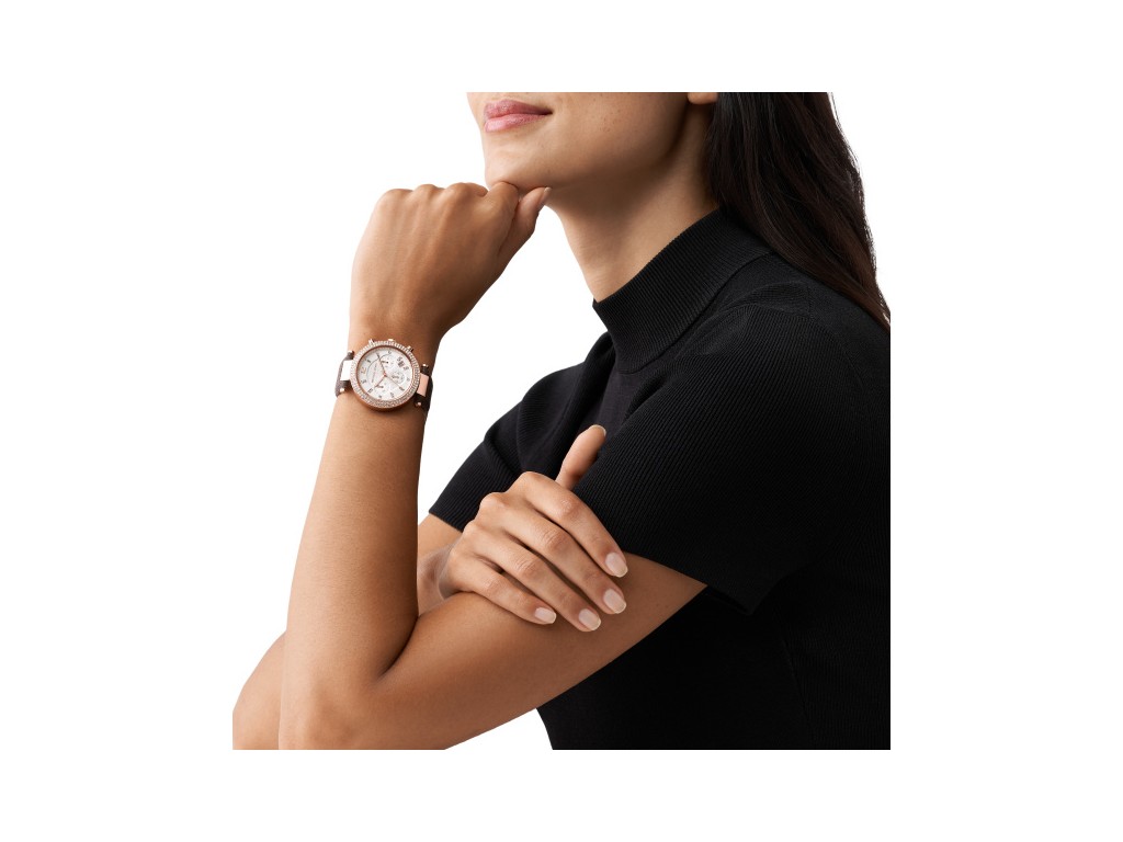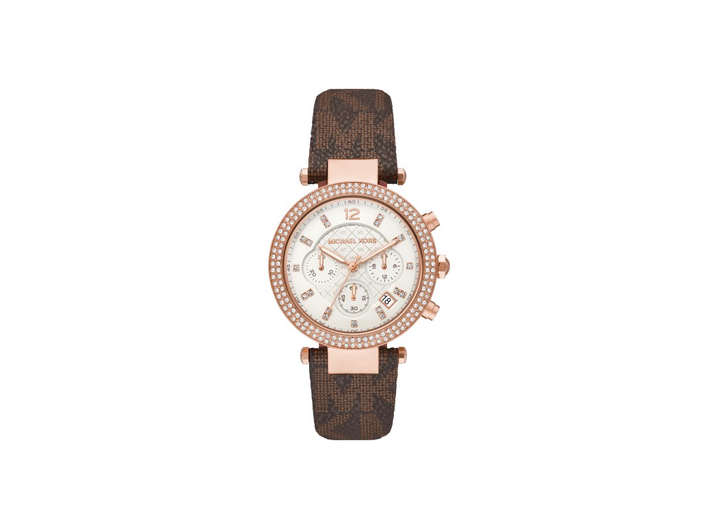 Oryginalny pasek do zegarka marki Michel Kors do modelu MK6917, wykonany ze skóry naturalnej powlekanej gumą w kolorze brązowym z logo Michael Kors, profilowany do koperty zegarka, sprzączka wykonana ze stali nierdzewnej w kolorze różowe złoto z napisem Michael Kors.