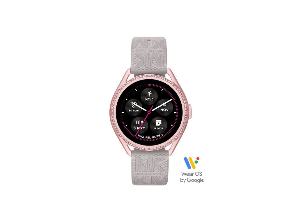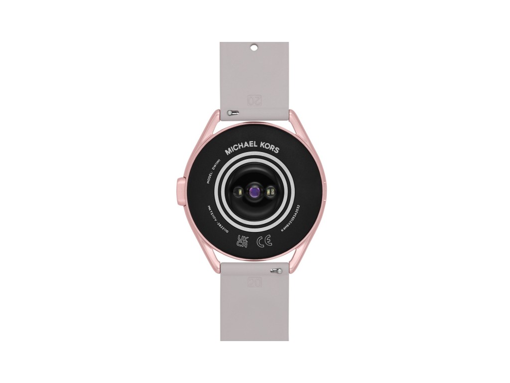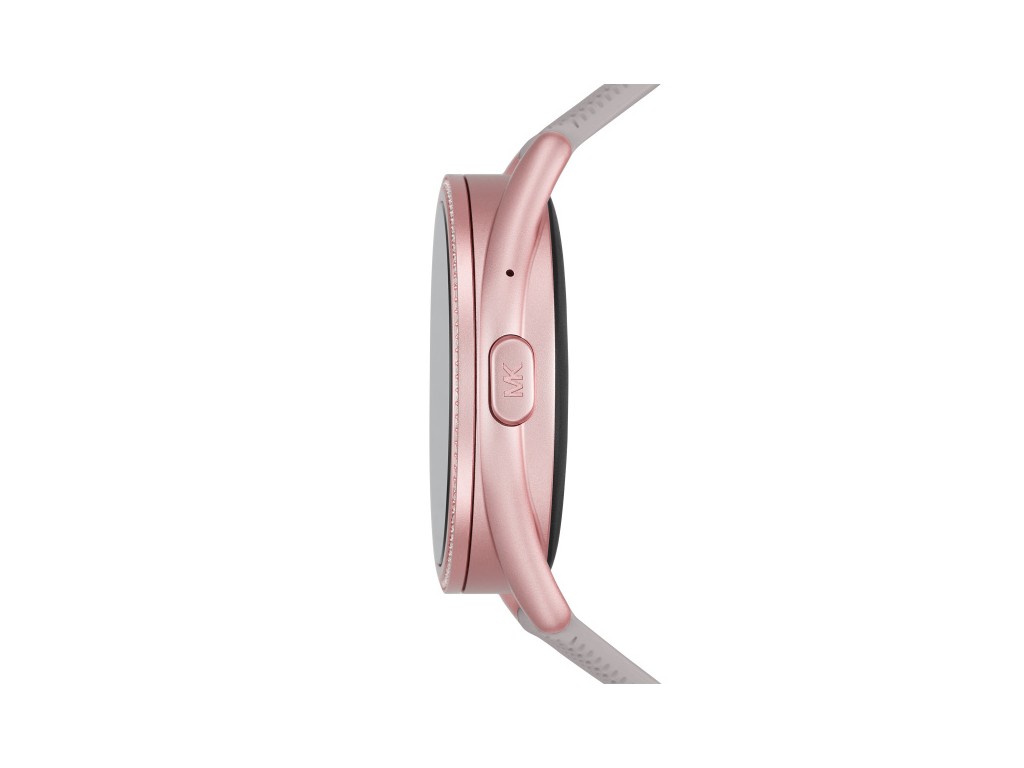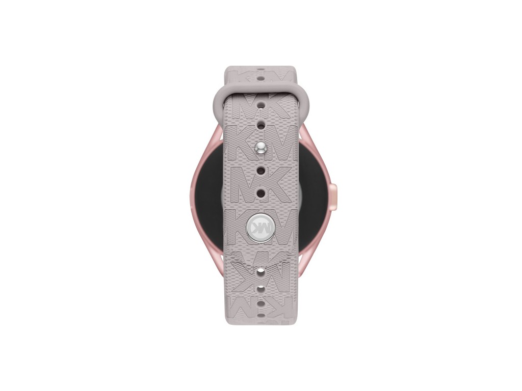 Oryginalny pasek do zegarka marki Michel Kors do modelu GEN 5E MKGO MKT5117 wykonany z gumy w kolorze szarym, na pasku tłoczone logo Michael Kors, elementy paska wykonane ze stali nierdzewnej w kolorze srebrnym.