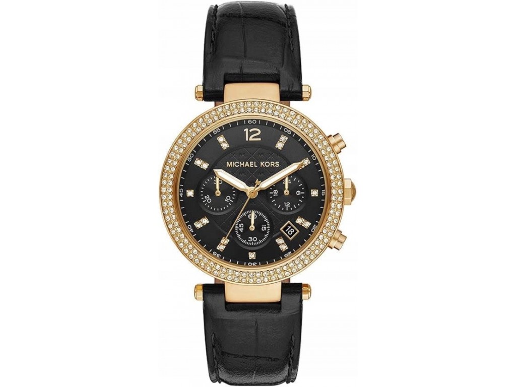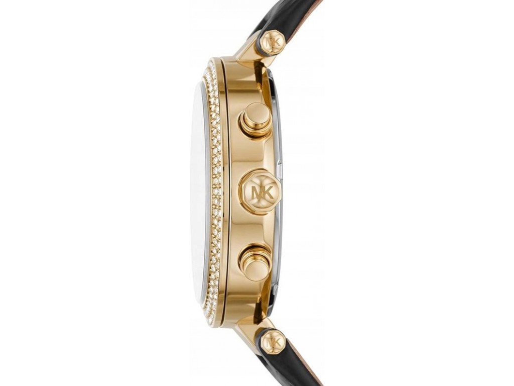 Oryginalny pasek do zegarka markiMichel Kors do modelu MK6984, wykonany ze skóry naturalnej w kolorze czarnym z tłoczeniem aligatora, profilowany do koperty zegarka, sprzączka wykonana ze stali nierdzewnej w kolorze złotym z napisem Michael Kors.