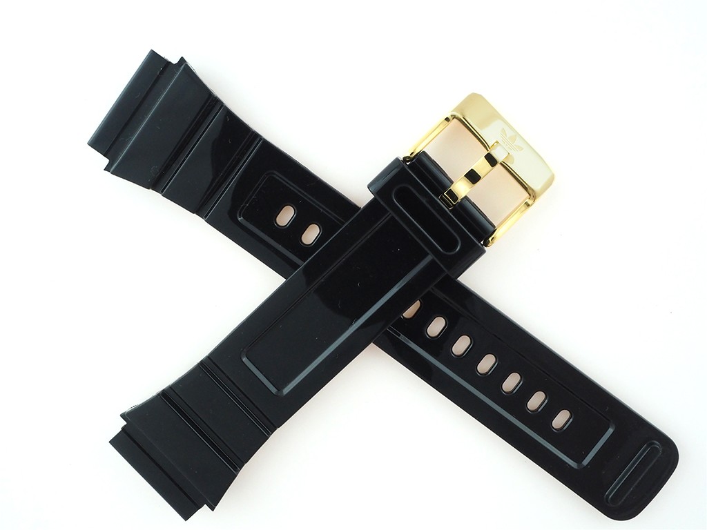 Oryginalny pasek do zegarka Adidas do modelu ADH1572 gumowy czarny lakierowany, sprzączka wykonana ze stali nierdzewnej w kolorze złotym połysk z logo Adidas.