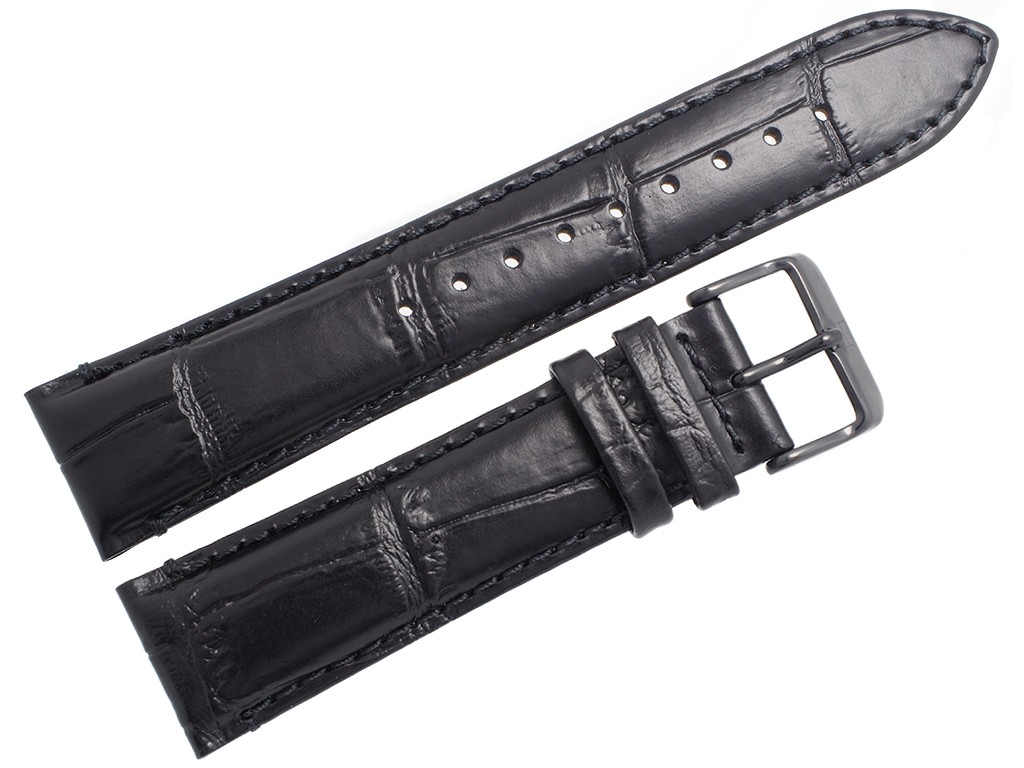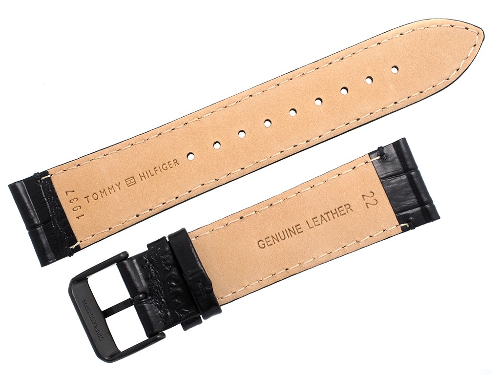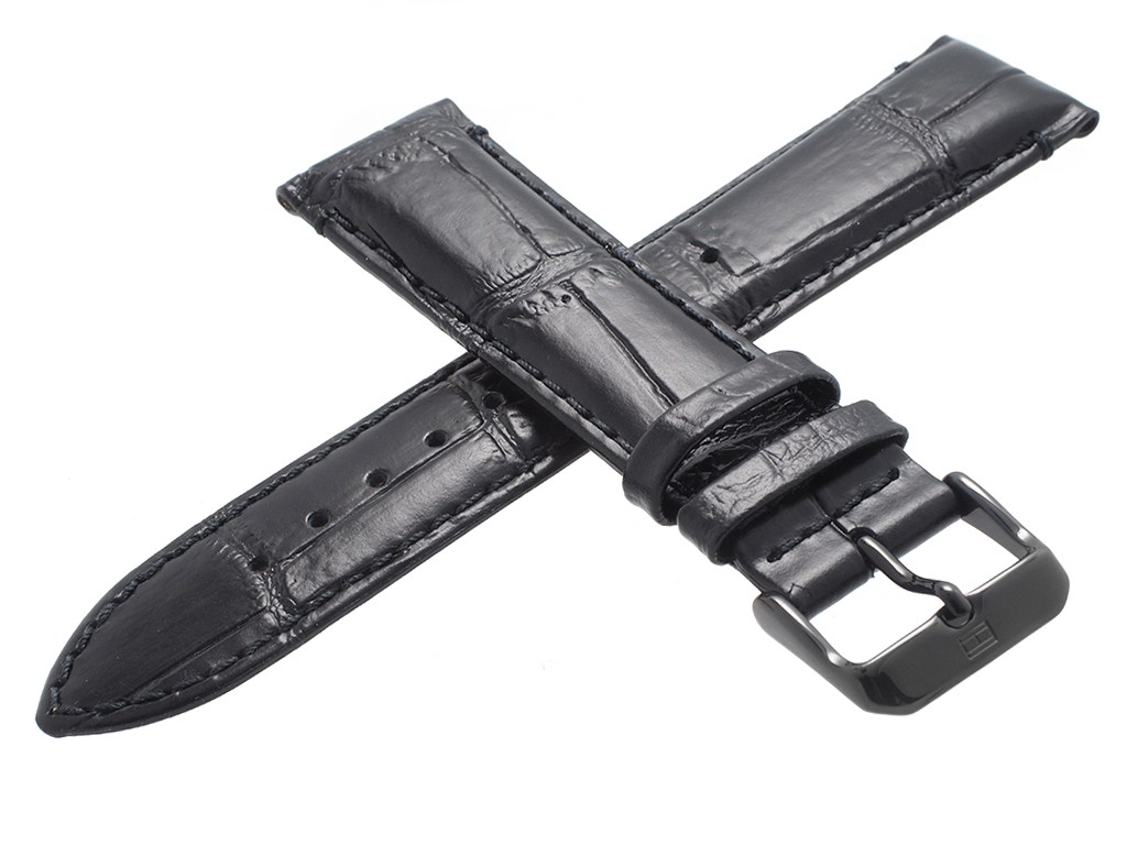 Oryginalny pasek do zegarka marki Tommy Hilfiger do modelu TH1791245, wykonany ze skóry naturalnej w kolorze czarnym, sprzączka wykonana ze stali nierdzewnej w kolorze czarnym połysk z logo marki, przeszyty nicią w kolorze paska, na pasku tłoczony wzór aligatora.