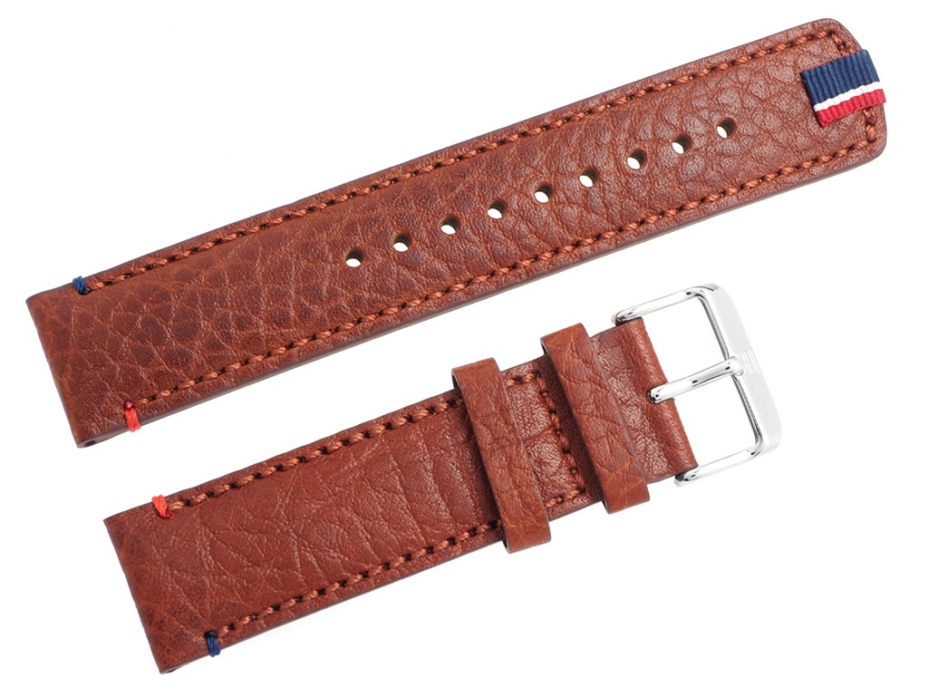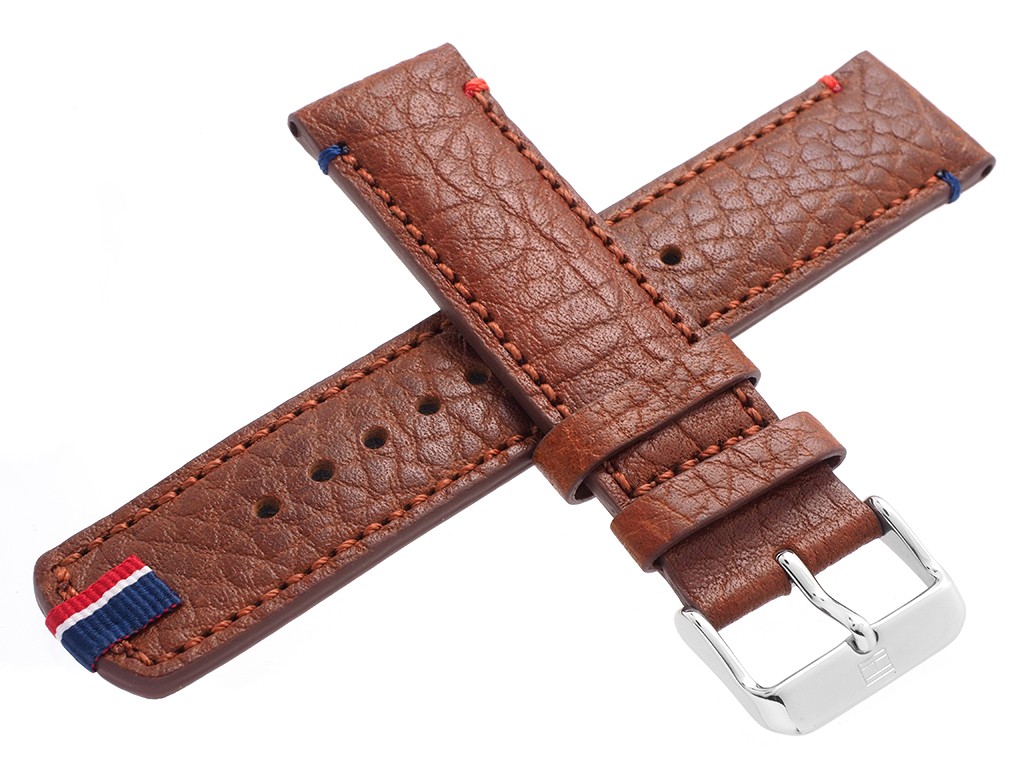 Oryginalny pasek do zegarka marki Tommy Hilfiger TH1791066, wykonany ze skóry naturalnej w kolorze brązowym, sprzączka wykonana ze stali nierdzewnej w kolorze srebrnym połysk z logo marki, przeszyty nicią w kolorze paska, na pasku faktura skóry.