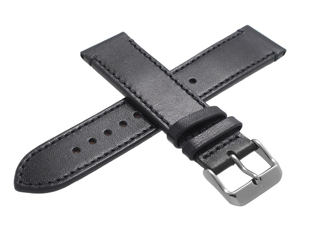 Oryginalny pasek do zegarka marki Tommy Hilfiger TH1791616, wykonany ze skóry naturalnej w kolorze czarnym, sprzączka wykonana ze stali nierdzewnej w kolorze szarym połysk z logo marki, przeszyty nicią w kolorze paska, gładki.