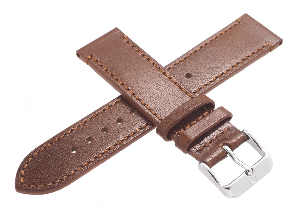 Oryginalny pasek do zegarka marki Tommy Hilfiger TH1791614, wykonany ze skóry naturalnej w kolorze brązowym, sprzączka wykonana ze stali nierdzewnej w kolorze srebrnym połysk z logo marki, przeszyty nicią w kolorze paska, gładki.
