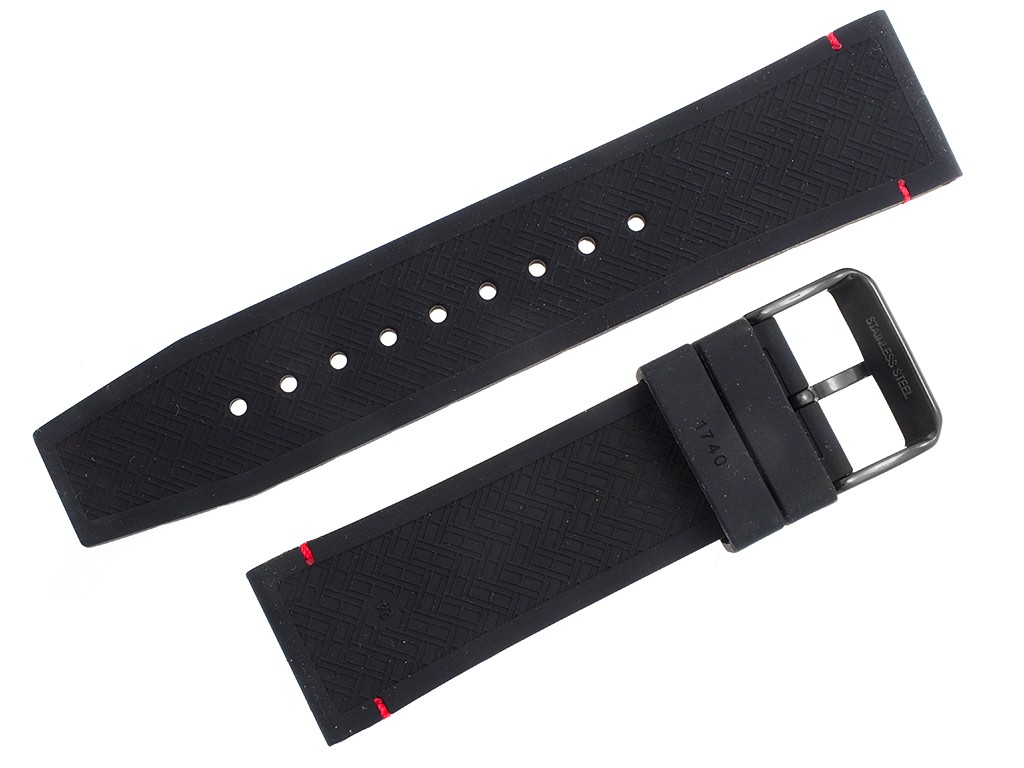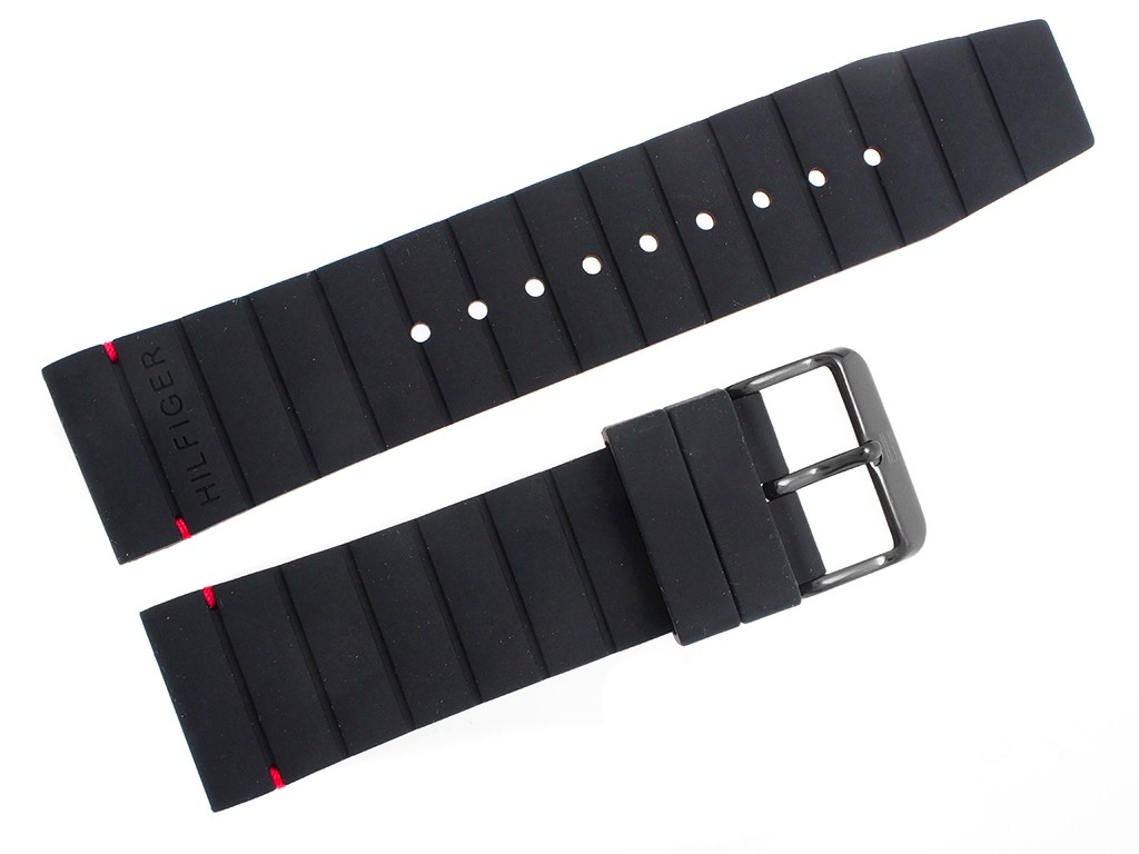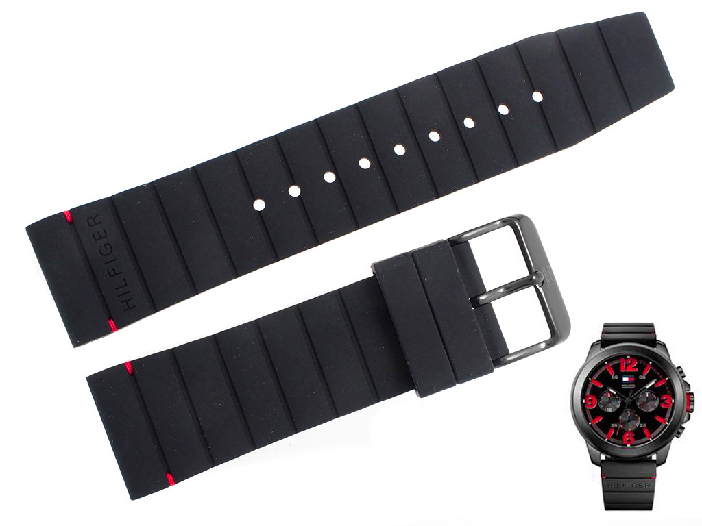 Oryginalny pasek do zegarka marki Tommy Hilfiger TH1791093 gumowy w kolorze czarnym, sprzączka wykonana ze stali nierdzewnej w kolorze czarnym połysk z logo marki, na pasku ozdobne czerwone akcenty.
