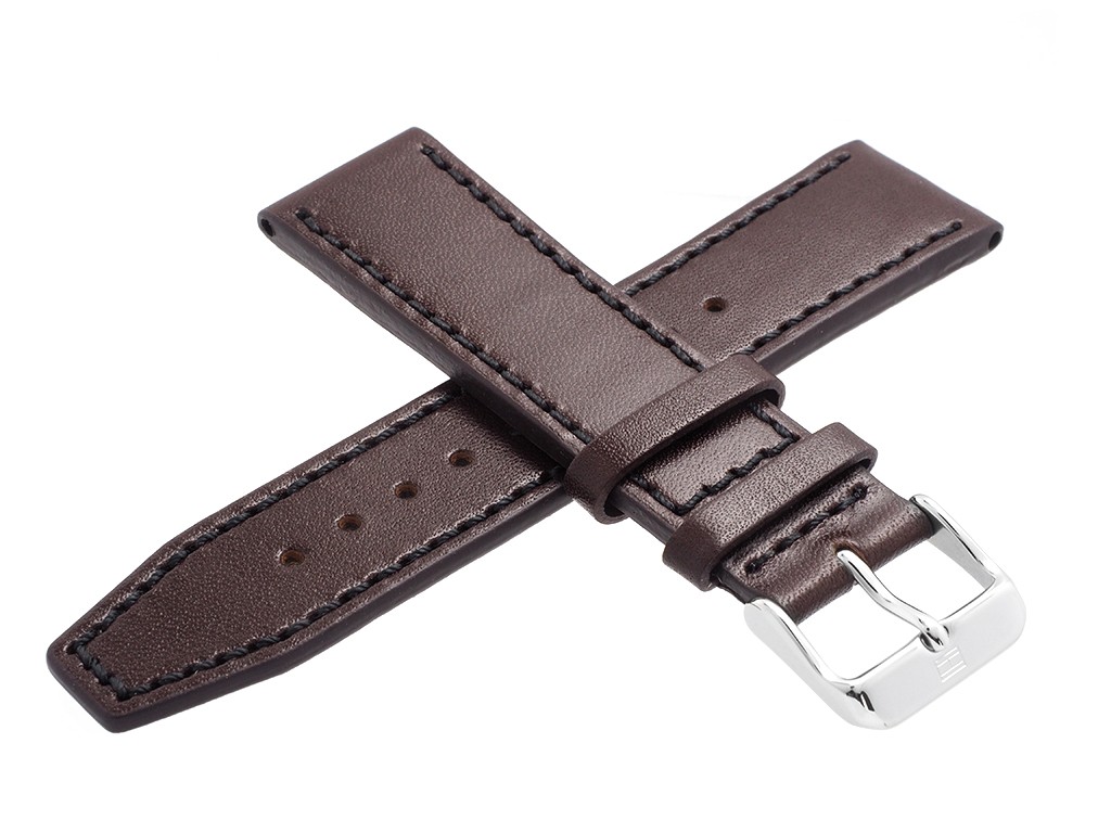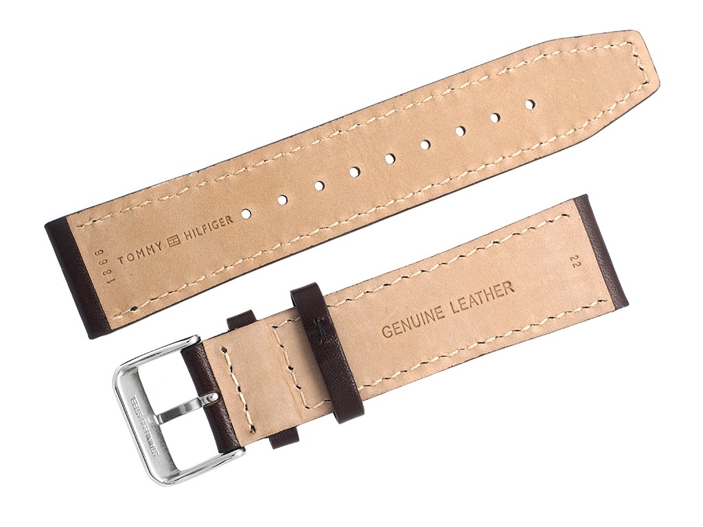 Oryginalny pasek do zegarka marki Tommy Hilfiger do modelu TH1791157, wykonany ze skóry naturalnej w kolorze brązowym, sprzączka wykonana ze stali nierdzewnej w kolorze srebrnym połysk z logo marki, przeszyty czarną nicią, gładki.