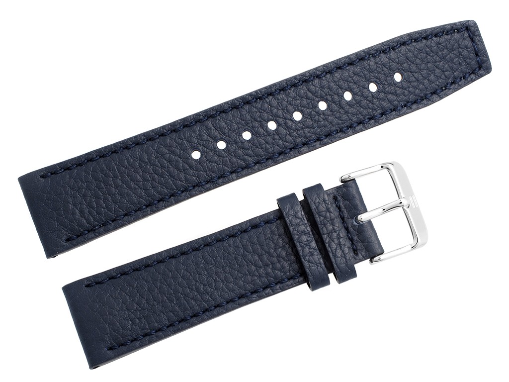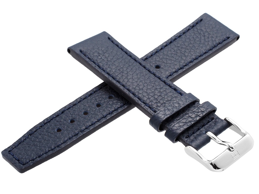 Oryginalny pasek do zegarka marki Tommy Hilfiger TH1791240, wykonany ze skóry naturalnej w kolorze granatowym, sprzączka wykonana ze stali nierdzewnej w kolorze srebrnym połysk z logo marki, przeszyty nicią w kolorze paska, na pasku faktura skóry.