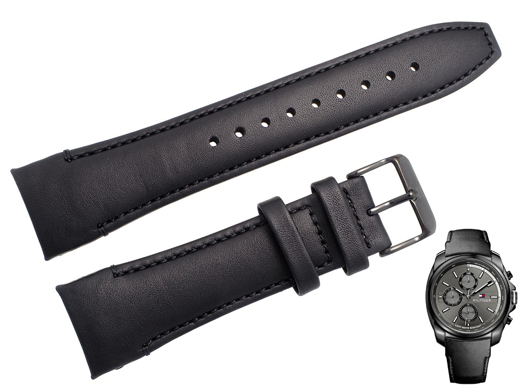 Oryginalny pasek do zegarka marki Tommy Hilfiger do modelu TH1791078, wykonany ze skóry naturalnej w kolorze czarnym, sprzączka wykonana ze stali nierdzewnej w kolorze czarnym połysk z logo marki, przeszyty nicią w kolorze paska, gładki.