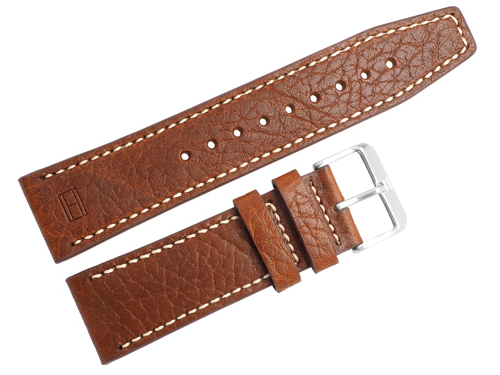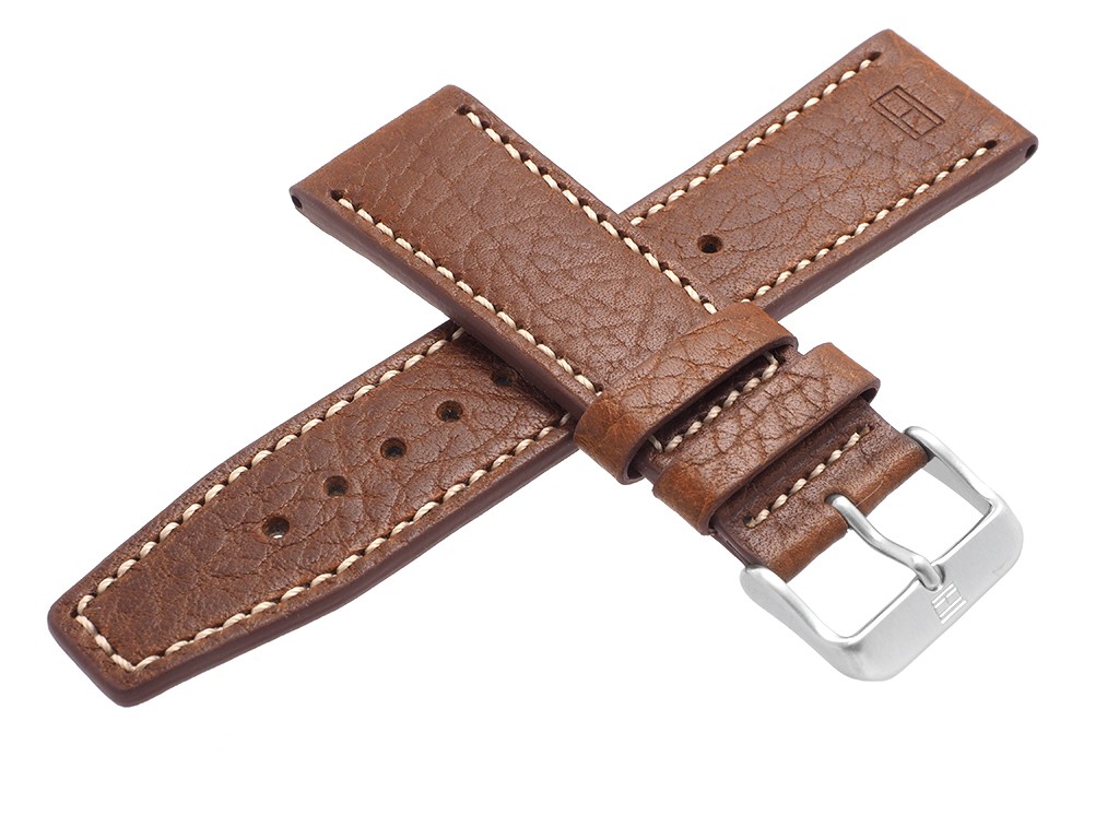 Oryginalny pasek do zegarka marki Tommy Hilfiger TH1791107, wykonany ze skóry naturalnej w kolorze brązowym, sprzączka wykonana ze stali nierdzewnej w kolorze srebrnym mat z logo marki, przeszyty jasną nicią, na pasku faktura skóry.