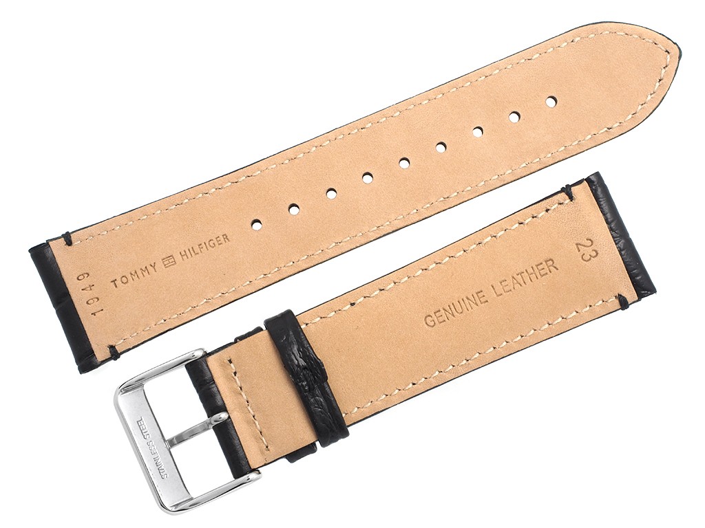 Oryginalny pasek do zegarka marki Tommy Hilfiger do modelu TH1791253, wykonany ze skóry naturalnej w kolorze czarnym, sprzączka wykonana ze stali nierdzewnej w kolorze srebrnym połysk z logo marki, przeszyty nicią w kolorze paska, na pasku tłoczony wzór aligatora.