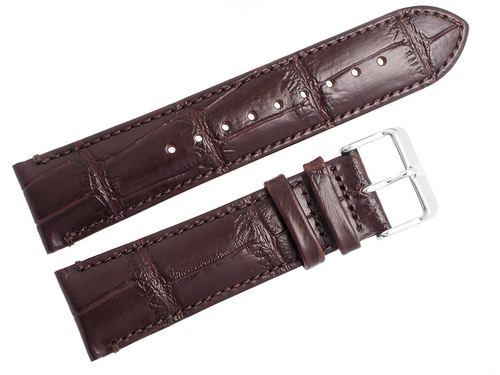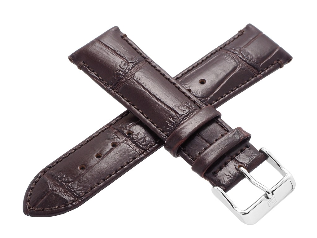 Oryginalny pasek do zegarka marki Tommy Hilfiger do modelu TH1791254, wykonany ze skóry naturalnej w kolorze brązowym, sprzączka wykonana ze stali nierdzewnej w kolorze srebrnym połysk z logo marki, przeszyty nicią w kolorze paska, na pasku tłoczony wzór aligatora.