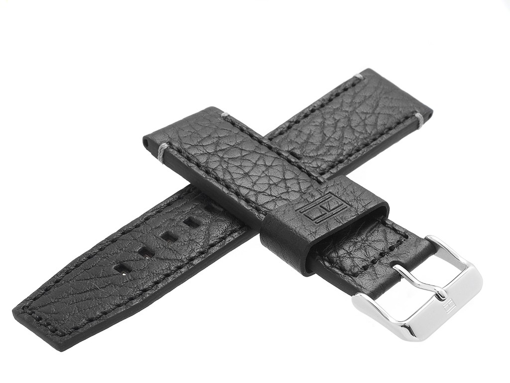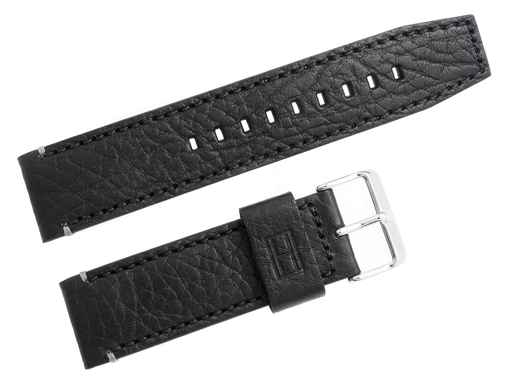 Oryginalny pasek do zegarka marki Tommy Hilfiger do modelu TH1791131, wykonany ze skóry naturalnej w kolorze czarnym, sprzączka wykonana ze stali nierdzewnej w kolorze srebrnym połysk z logo marki, przeszyty nicią w kolorze paska, na pasku tłoczony wzór skóry. Na pasku ozdobne szare przeszycia.