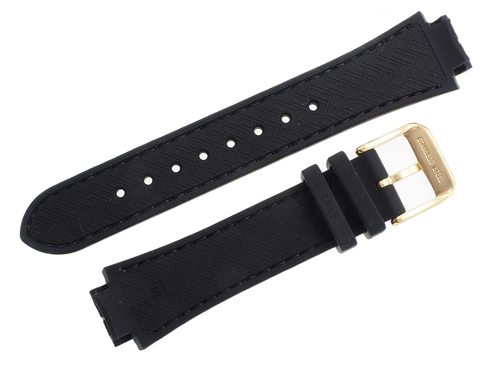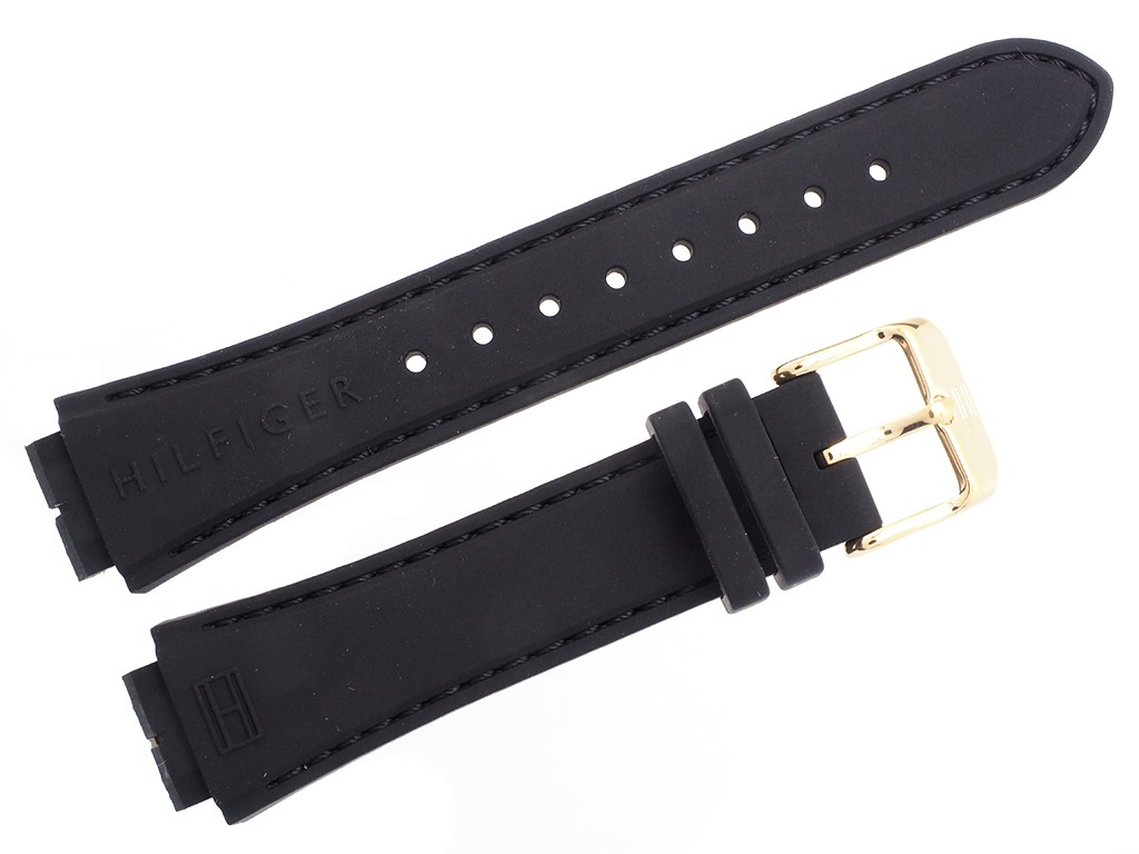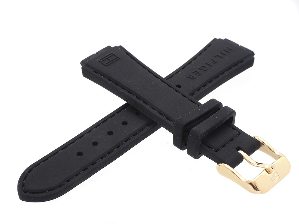 Oryginalny pasek do zegarka marki Tommy Hilfiger do modelu TH1781313, silikonowy w kolorze czarnym, sprzączka wykonana ze stali nierdzewnej w kolorze złotym połysk z logo marki. Na pasku napis Hilfiger i logo marki.