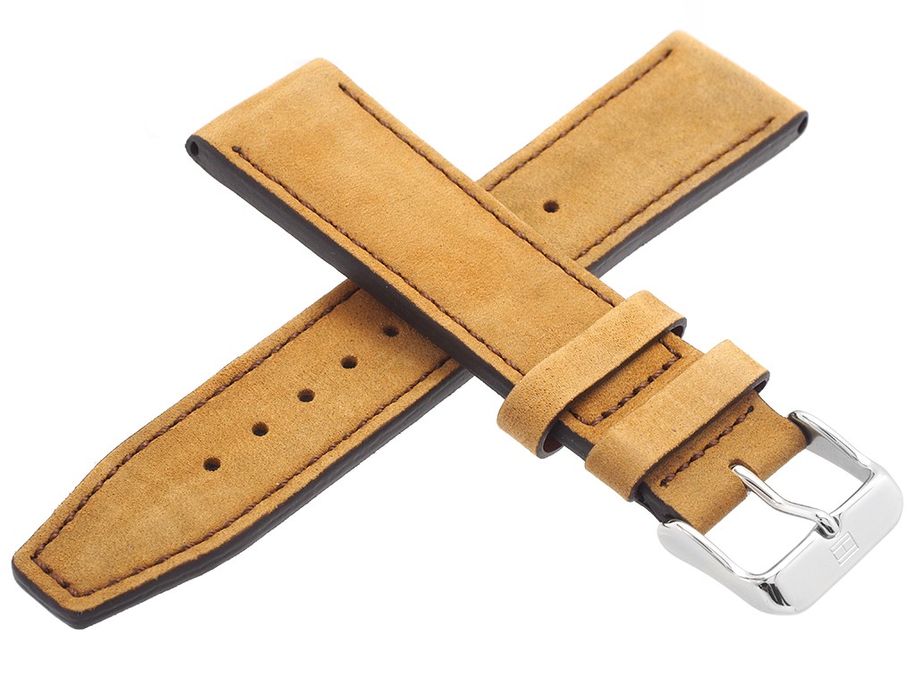 Oryginalny pasek do zegarka marki Tommy Hilfiger do modelu TH1791424,wykonany ze skóry zamsz w kolorze jasny brąz, sprzączka wykonana ze stali nierdzewnej w kolorze srebrnym połysk z logo marki, przeszyty brązową nicią, gładki.