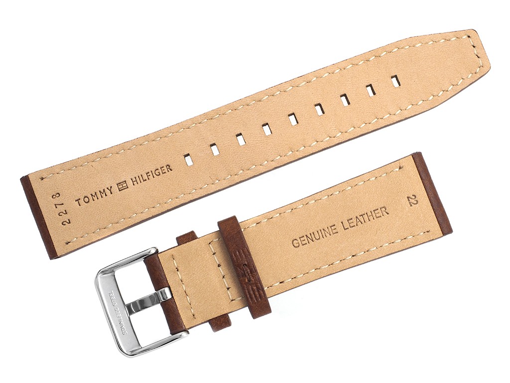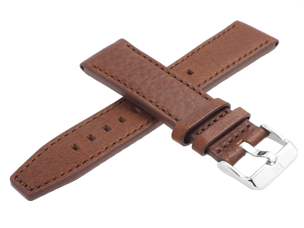 Oryginalny pasek do zegarka marki Tommy Hilfiger do modelu TH1791561, wykonany ze skóry naturalnej w kolorze brązowym, sprzączka wykonana ze stali nierdzewnej w kolorze srebrnym połysk z logo marki, przeszyty nicią w kolorze paska, na pasku wzór skóry.