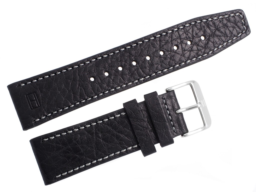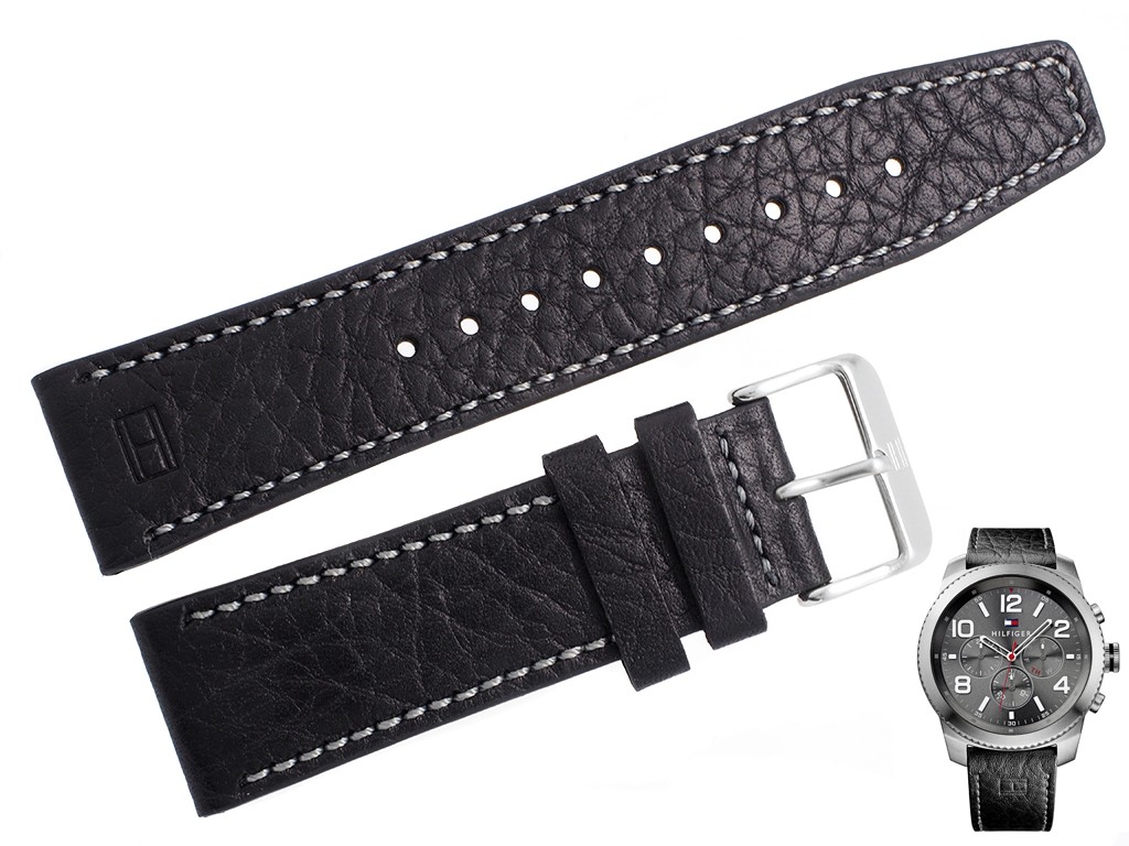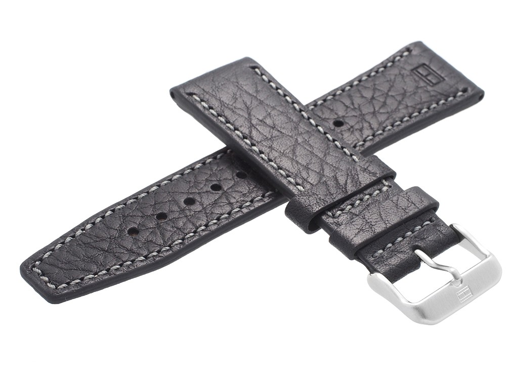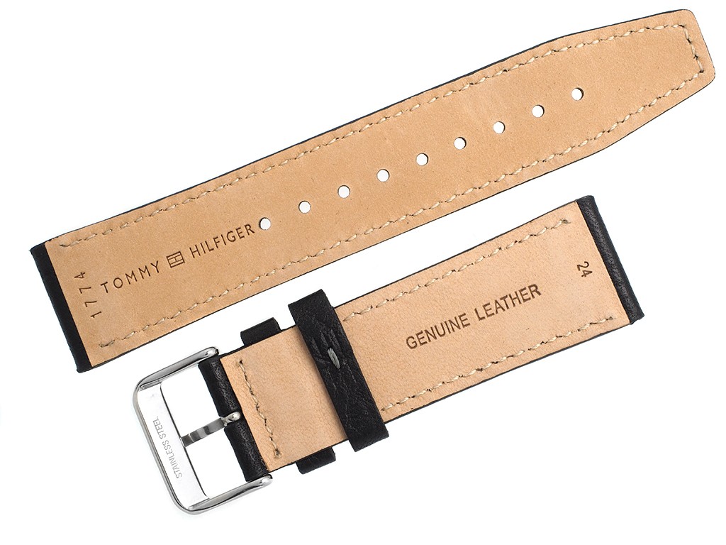Oryginalny pasek do zegarka marki Tommy Hilfiger TH1791110, wykonany ze skóry naturalnej w kolorze czarnym, sprzączka wykonana ze stali nierdzewnej w kolorze srebrnym mat z logo marki, przeszyty jasną nicią, na pasku faktura skóry.