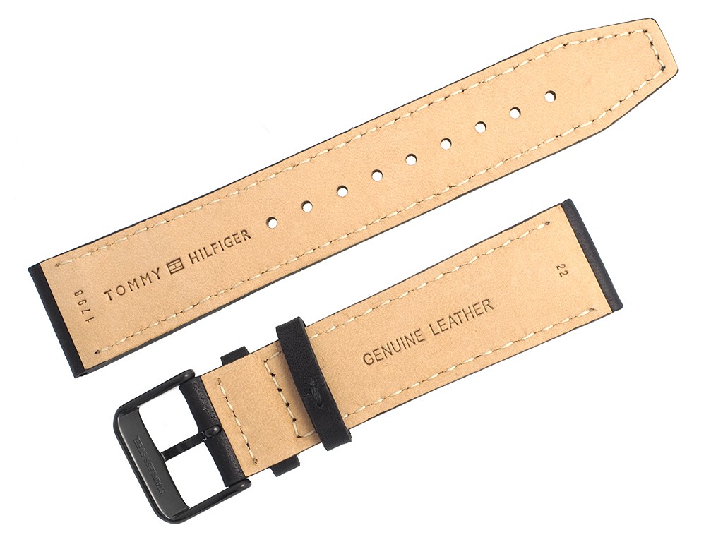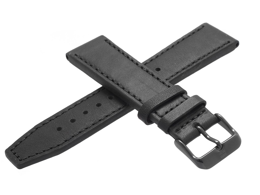 Oryginalny pasek do zegarka marki Tommy Hilfiger do modelu TH1791103,wykonany ze skóry naturalnej w kolorze czarnym, sprzączka wykonana ze stali nierdzewnej w kolorze czarnym połysk z logo marki, przeszyty nicią w kolorze paska, gładki.