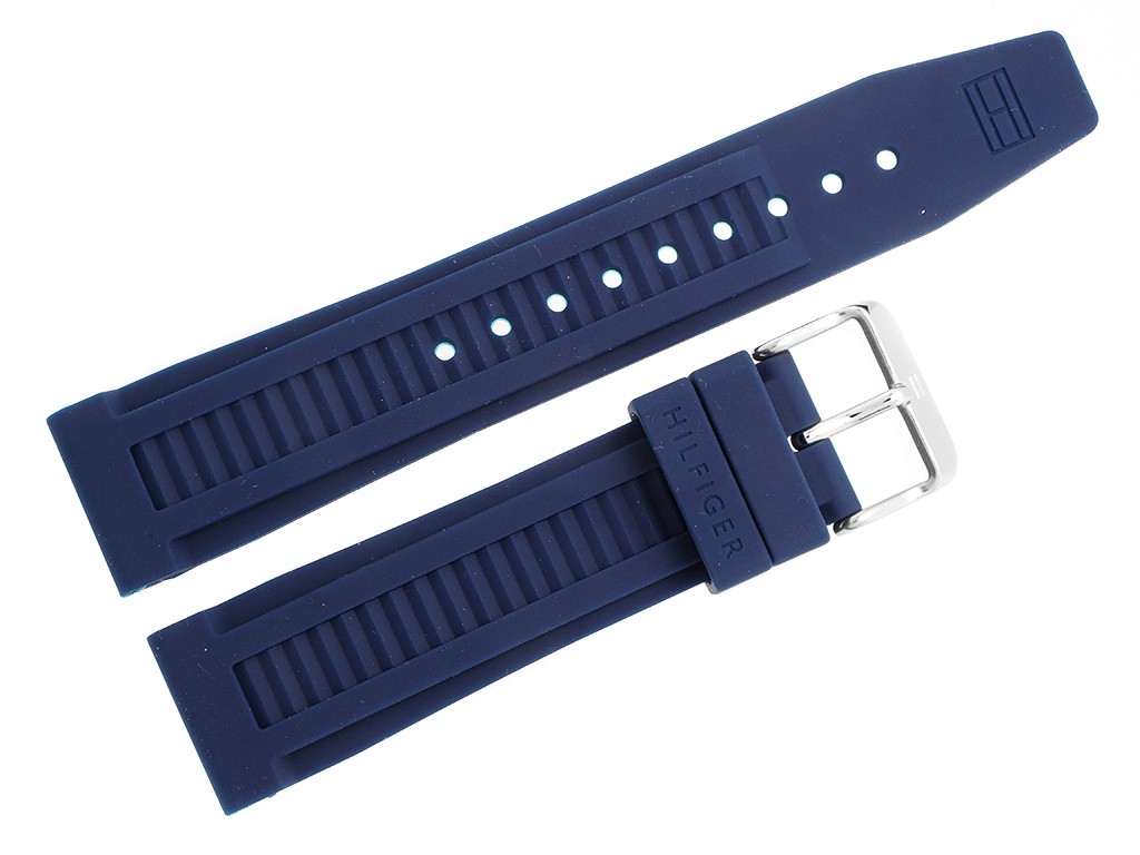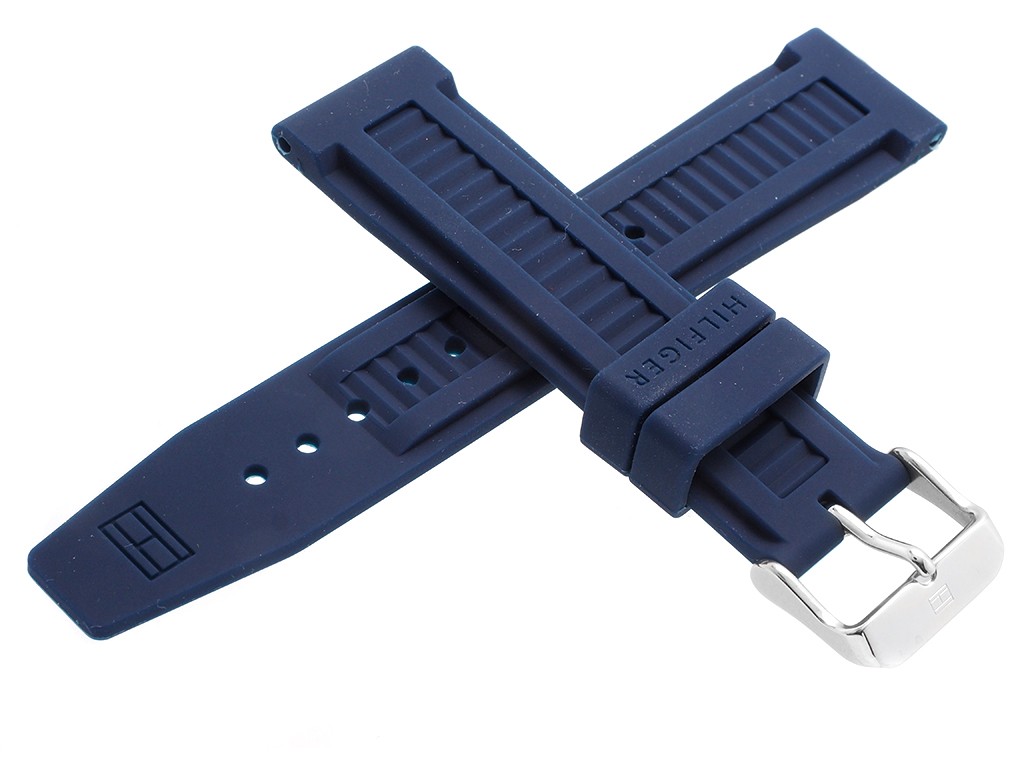 Oryginalny pasek do zegarka marki Tommy Hilfiger TH1790918 gumowy w kolorze granatowym, sprzączka wykonana ze stali nierdzewnej w kolorze srebrnym połysk z logo marki.