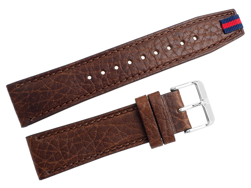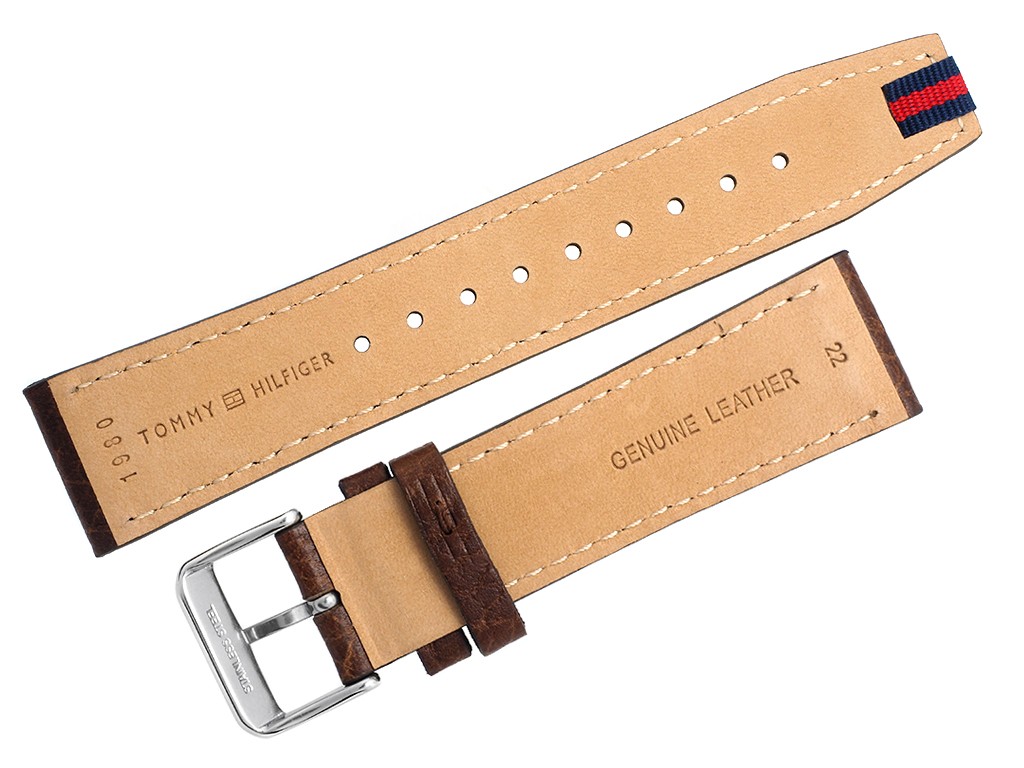 Oryginalny pasek do zegarka marki Tommy Hilfiger do modelu TH1791275, wykonany ze skóry naturalnej w kolorze brązowym, sprzączka wykonana ze stali nierdzewnej w kolorze srebrnym połysk z logo marki, przeszyty nicią w kolorze paska, na pasku tłoczony wzór skóry.