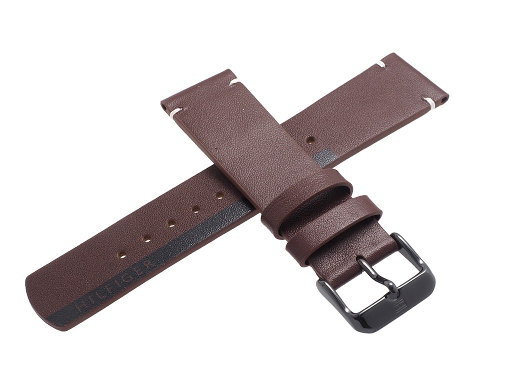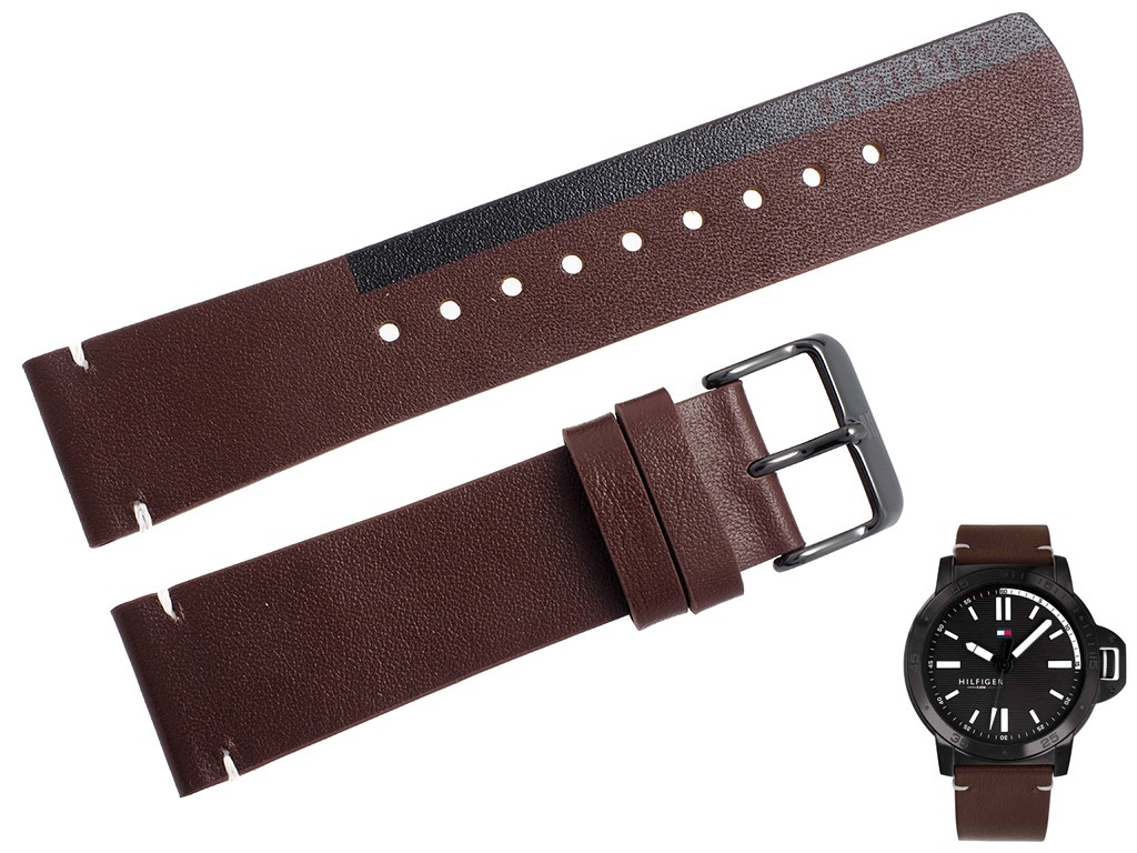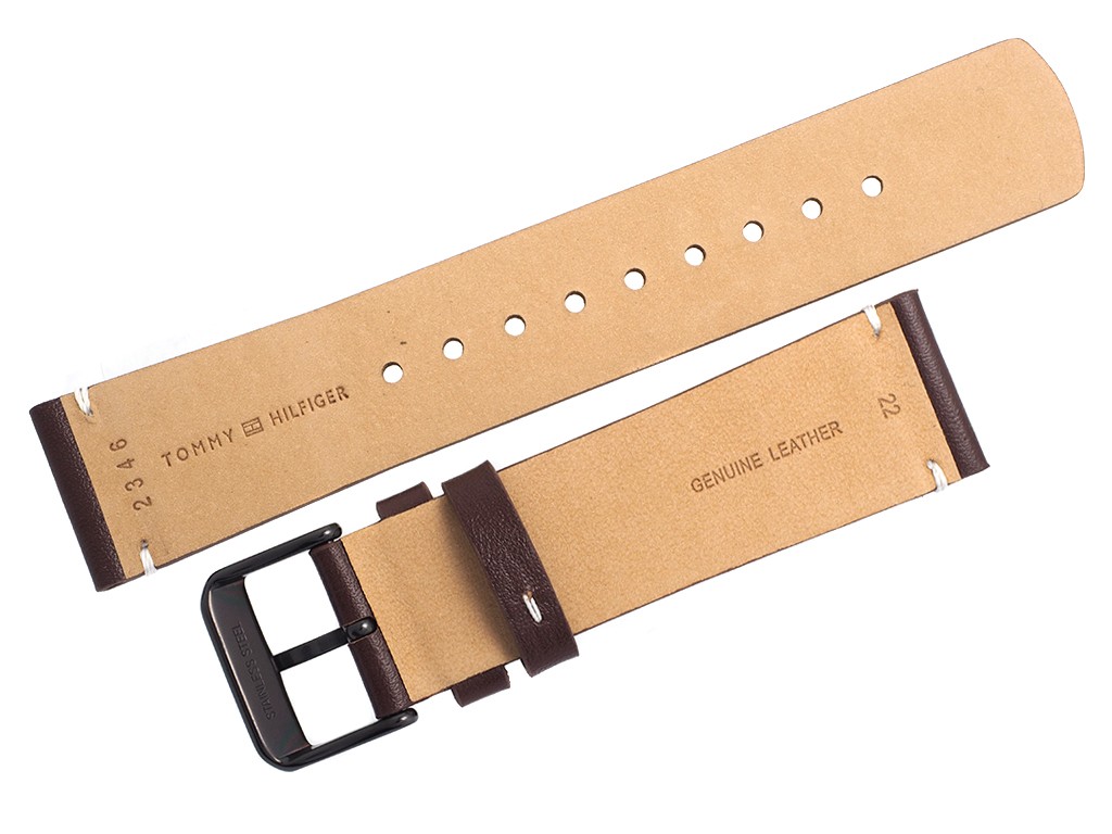 Oryginalny pasek do zegarka marki Tommy Hilfiger do modelu TH1791589, wykonany ze skóry naturalnej w kolorze brązowym, sprzączka wykonana ze stali nierdzewnej w kolorze czarnym połysk z logo marki, gładki, na pasku ozdobne jasne przeszycia oraz napis Hilfiger.