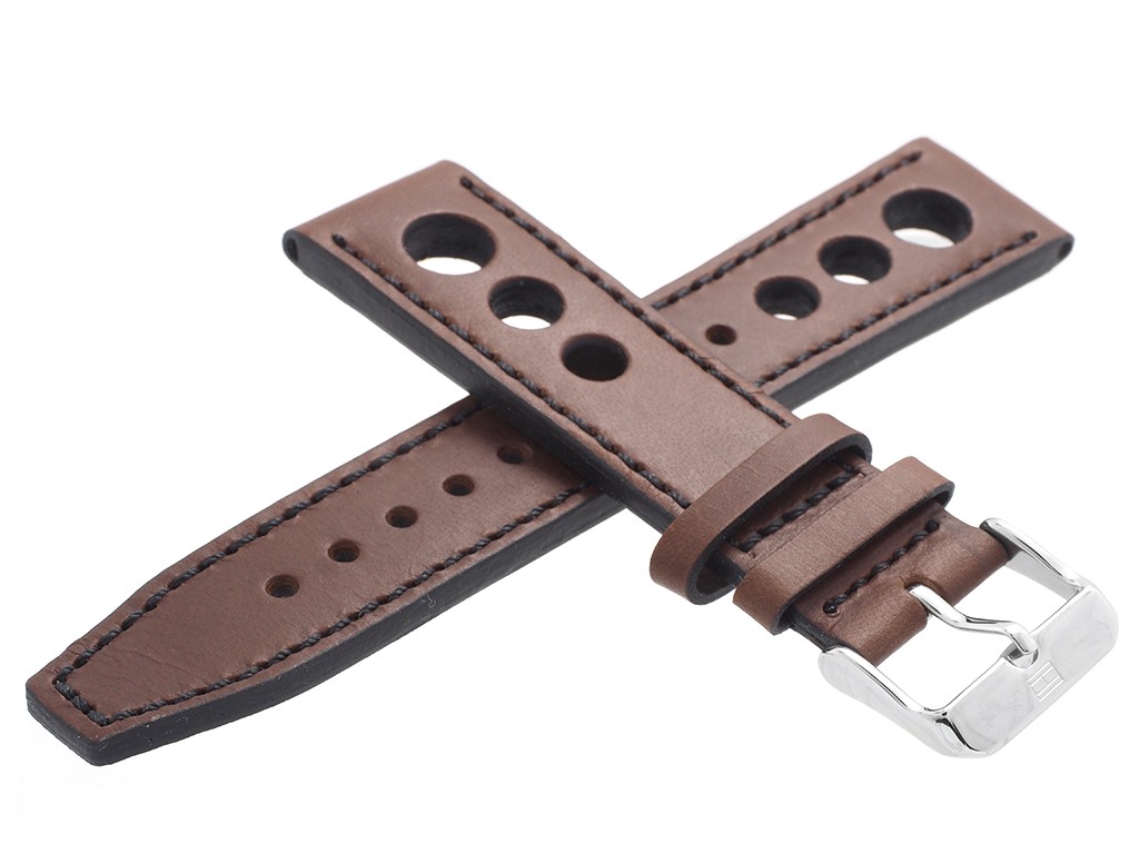 Oryginalny pasek do zegarka marki Tommy Hilfiger do modelu TH 1791049, wykonany ze skóry naturalnej w kolorze brązowym, sprzączka wykonana ze stali nierdzewnej w kolorze srebrnym połysk z logo marki, przeszyty ciemną nicią, gładki, na pasku wycięte otwory.