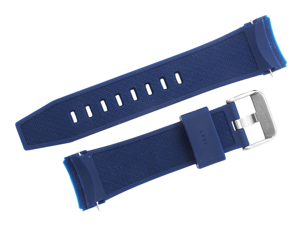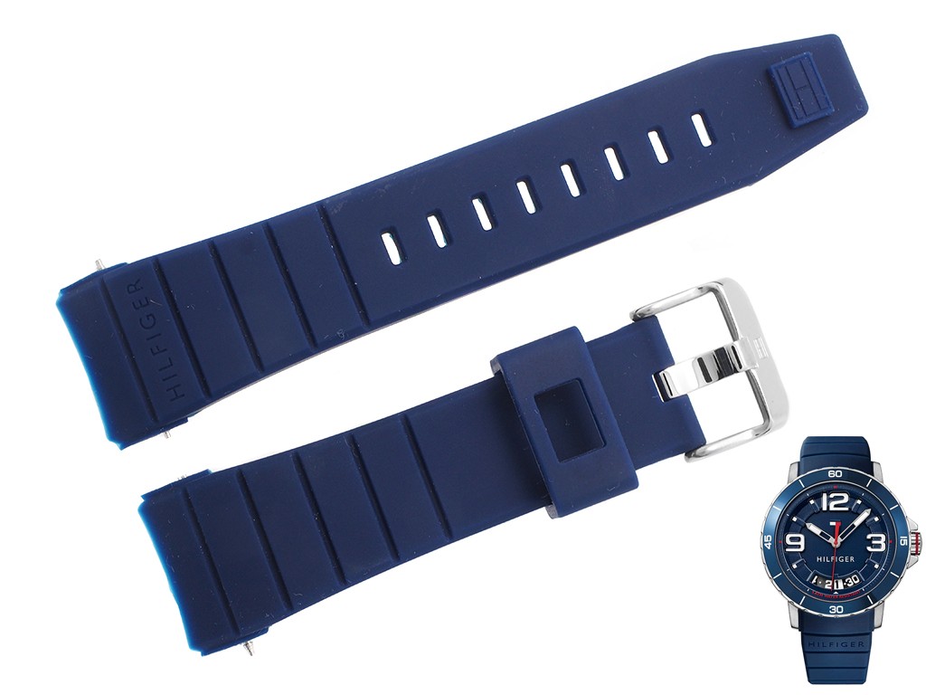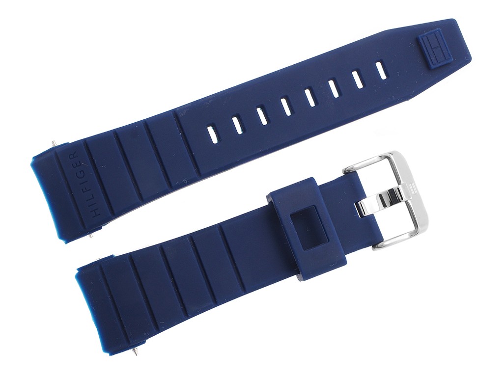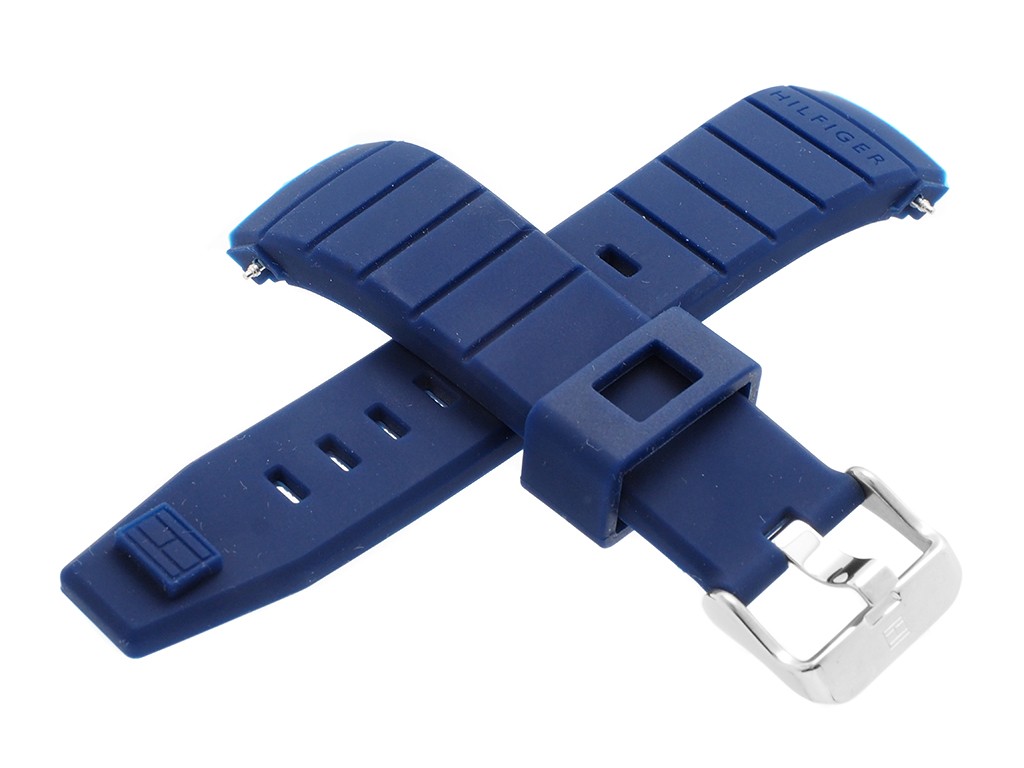 Oryginalny pasek do zegarka marki Tommy Hilfiger do modelu TH1791250, gumowy w kolorze niebieskim, sprzączka wykonana ze stali nierdzewnej w kolorze srebrnym połysk z logo marki.