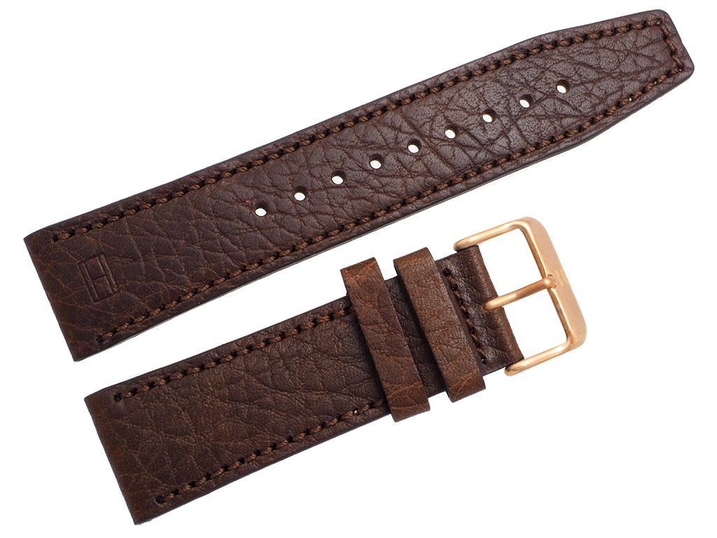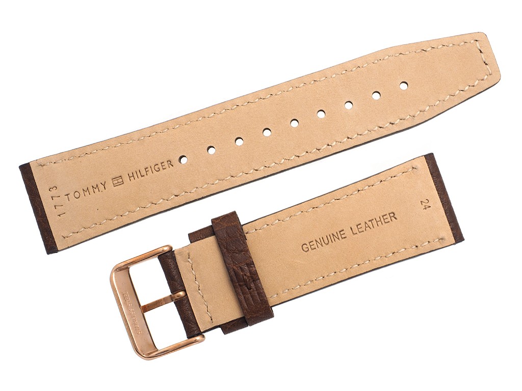 Oryginalny pasek do zegarka marki Tommy Hilfiger TH1791109, wykonany ze skóry naturalnej w kolorze ciemnym brązowym, sprzączka wykonana ze stali nierdzewnej w kolorze różowe złoto połysk z logo marki, przeszyty nicią, na pasku faktura skóry.