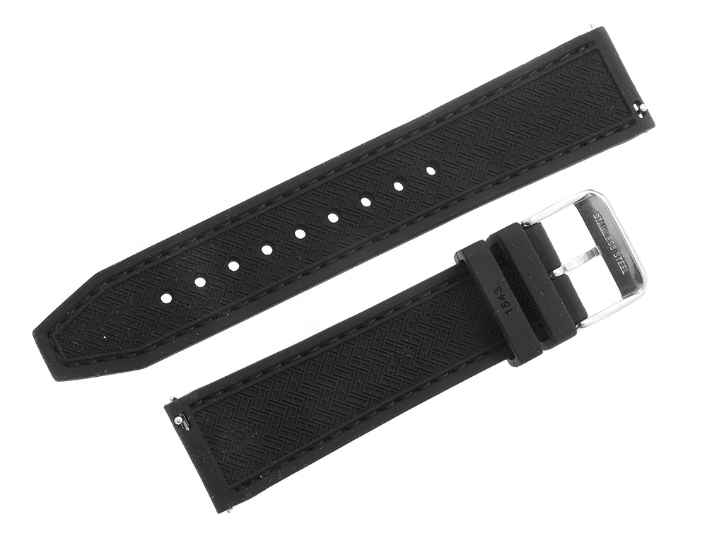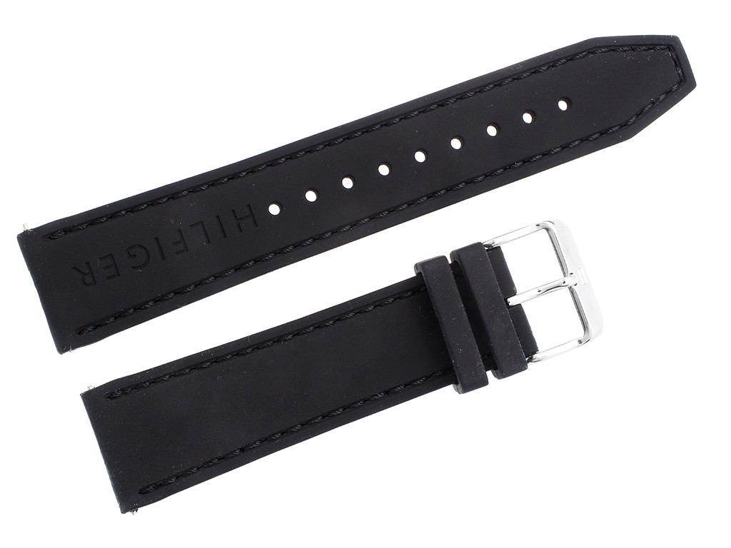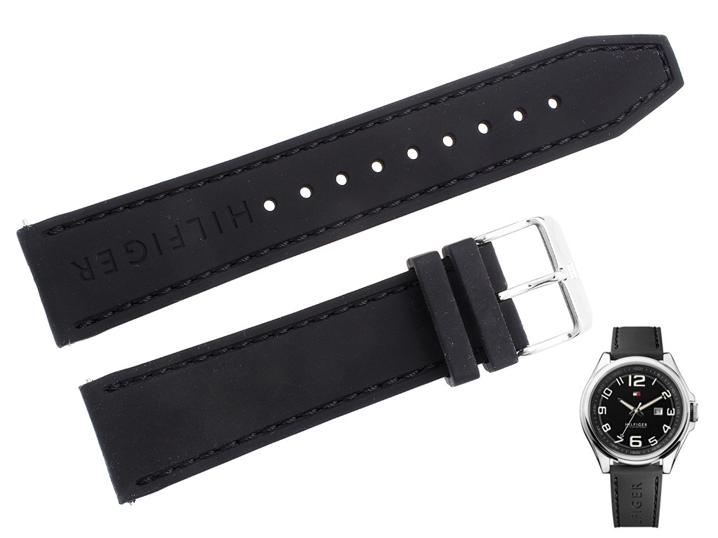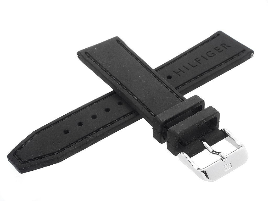 Oryginalny pasek do zegarka marki Tommy Hilfiger do modelu TH1790910, gumowy, czarny, sprzączka wykonana ze stali nierdzewnej w kolorze srebrnym połysk z logo marki, przeszyty nicią w kolorze paska, gładki.