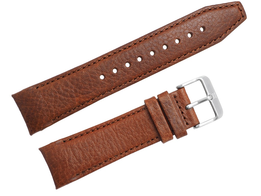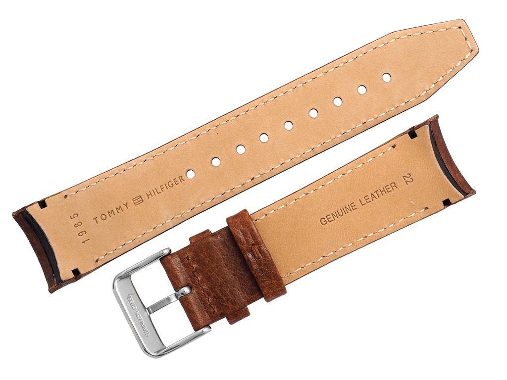 Oryginalny pasek do zegarka marki Tommy Hilfiger do modelu TH1791269, wykonany ze skóry naturalnej w kolorze brązowym, sprzączka wykonana ze stali nierdzewnej w kolorze srebrnym mat z logo marki, przeszyty nicią w kolorze paska, faktura skóry.