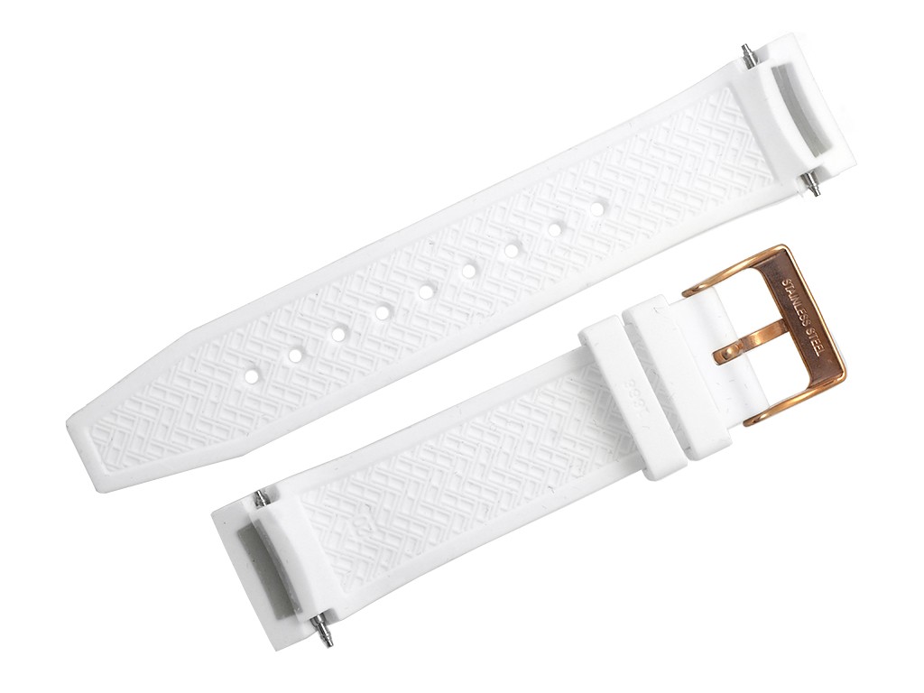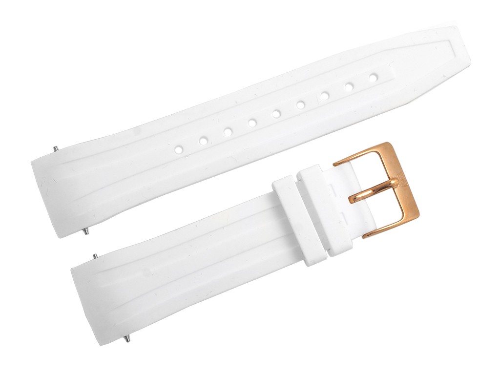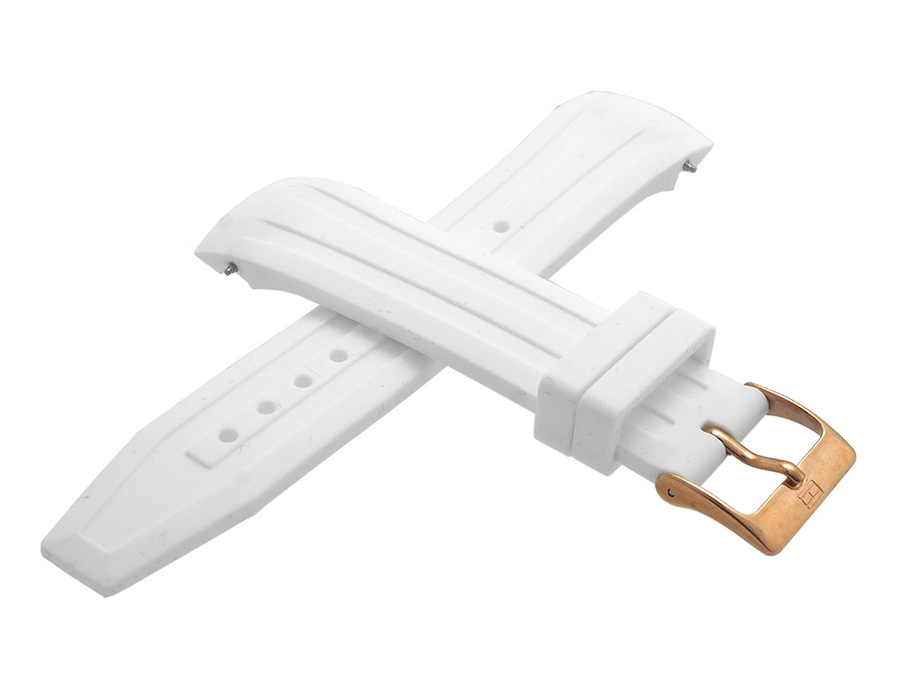 Oryginalny pasek do zegarka marki Tommy Hilfiger TH1781388, wykonany z silikonu w kolorze bialym, sprzączka wykonana ze stali nierdzewnej w kolorze różowe złoto połysk z logo marki.
