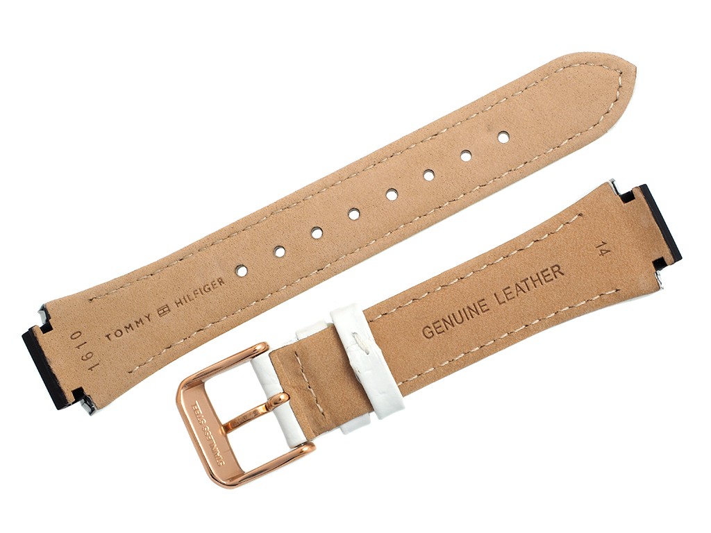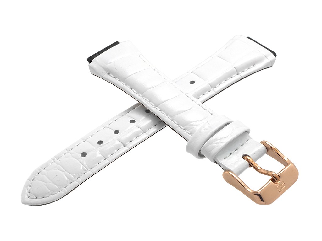 Oryginalny pasek do zegarka marki Tommy Hilfiger TH1781362, wykonany ze skóry w kolorze bialym, na pasku tłoczony wzór aligatora, sprzączka wykonana ze stali nierdzewnej w kolorze różowe złoto połysk z logo marki.