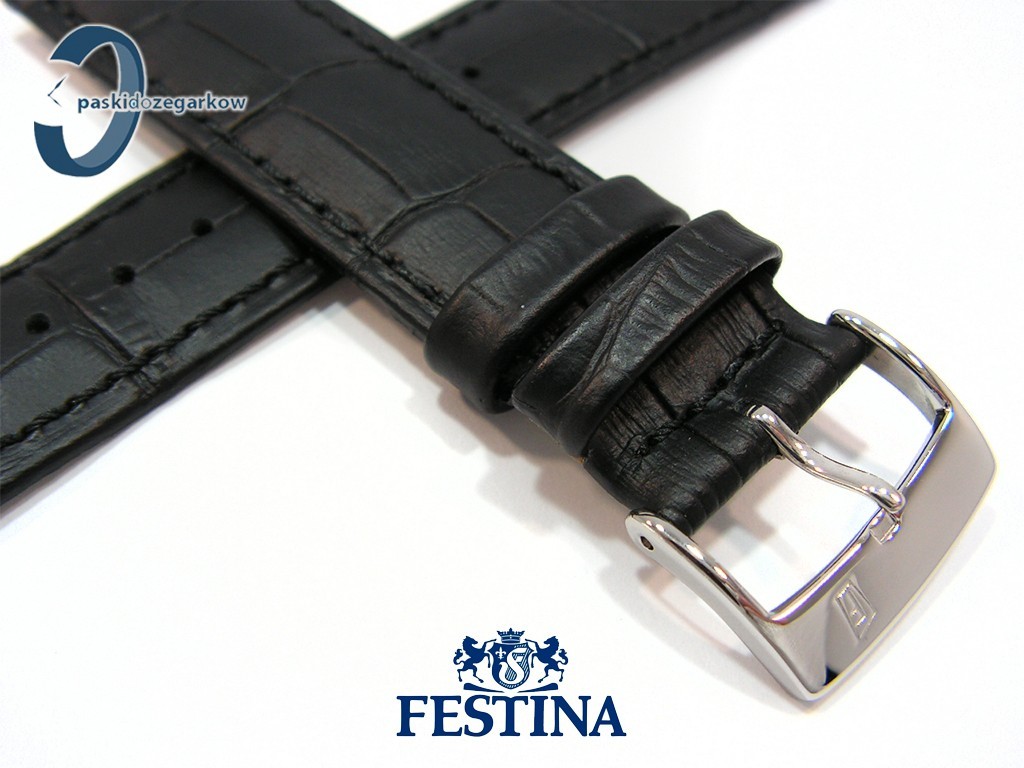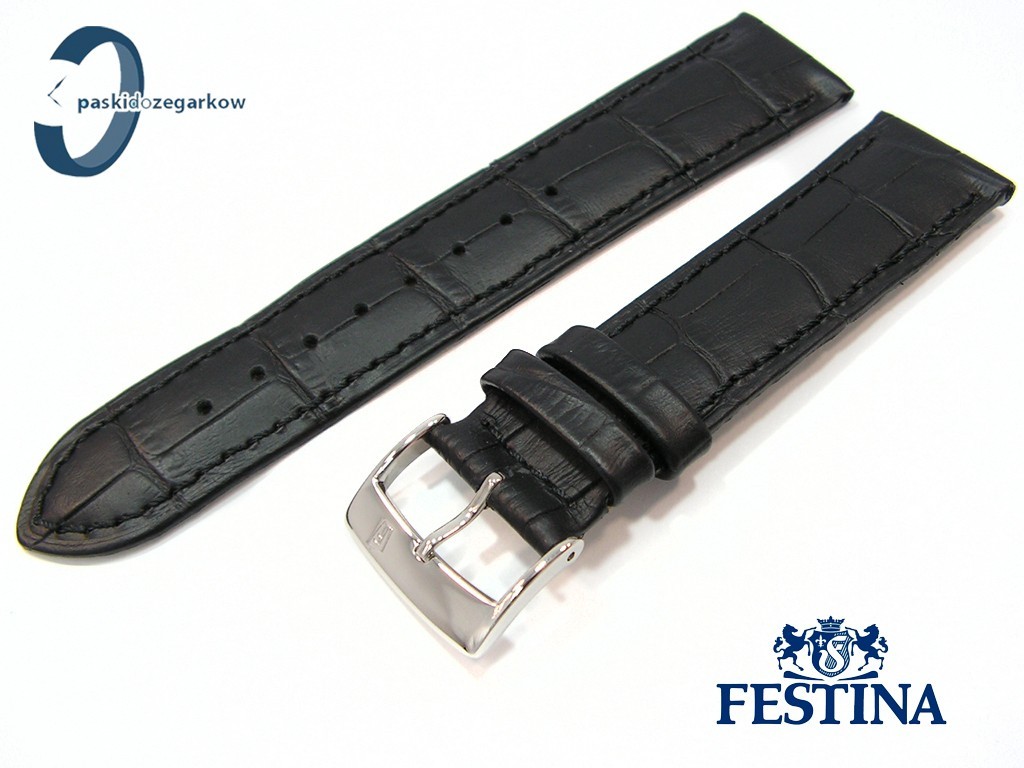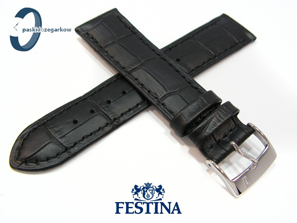 Oryginalny pasek do zegarka marki Festina do modelu F16518 skórzany, czarny, matowy, na pasku wytłoczony wzór aligatora, sprzączka stalowa z logo Festina, niewypełniany, przeszyty czarną nicią, szerokość paska 21 mm, pasuje do innych zegarków z rozmiarem koperty 21 mm.