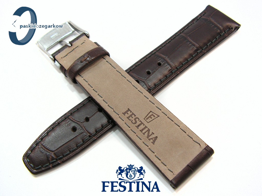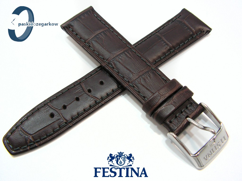 Oryginalny pasek do zegarka marki Festina do modelu F20201 skórzany, brązowy, przeszyty, matowy, na pasku tłoczony wzór aligatora, rozmiar paska 21 mm, pasuje do innych zegarków z rozstawem koperty 21 mm, sprzączka stalowa w kolorze srebrnym z napisem Festina.