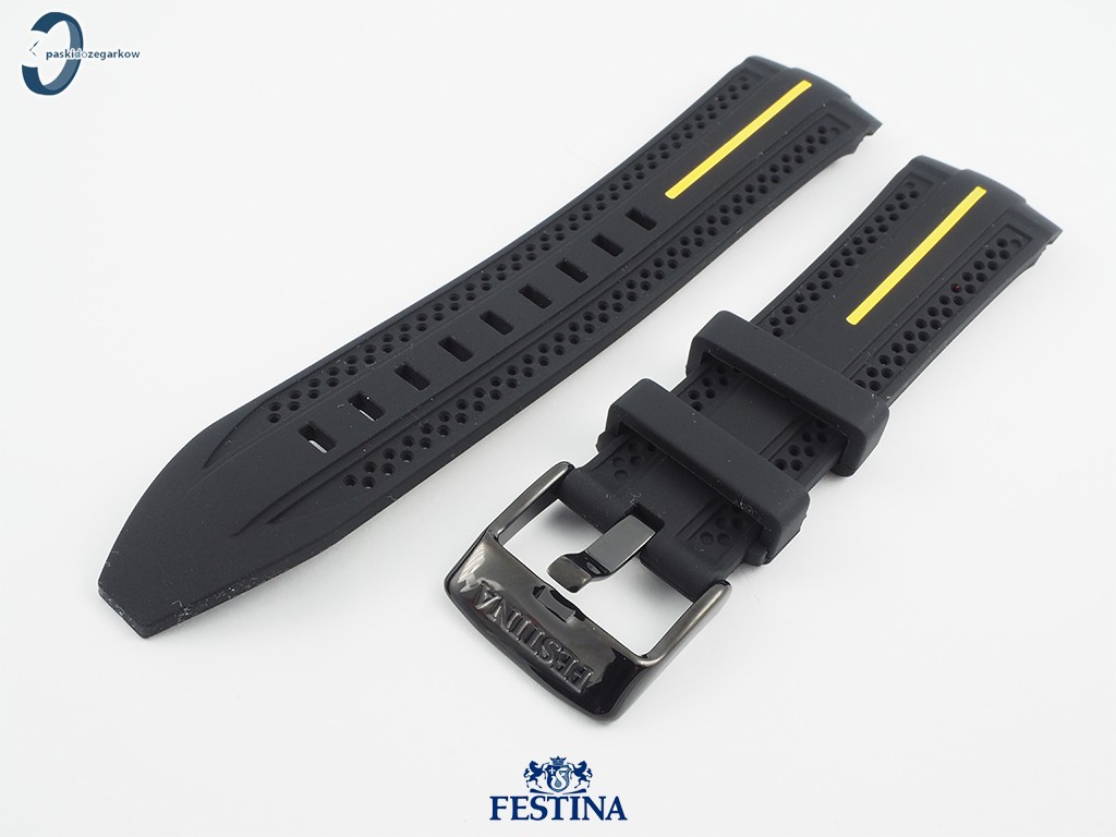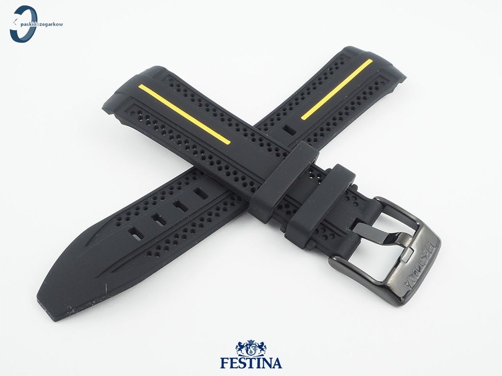 Oryginalny pasek do zegarka Festina do modelu F20366 gumowy w kolorze czarnym, na pasku żółty akcent, sprzączka wykonana ze stali nierdzewnej w kolorze czarnym.