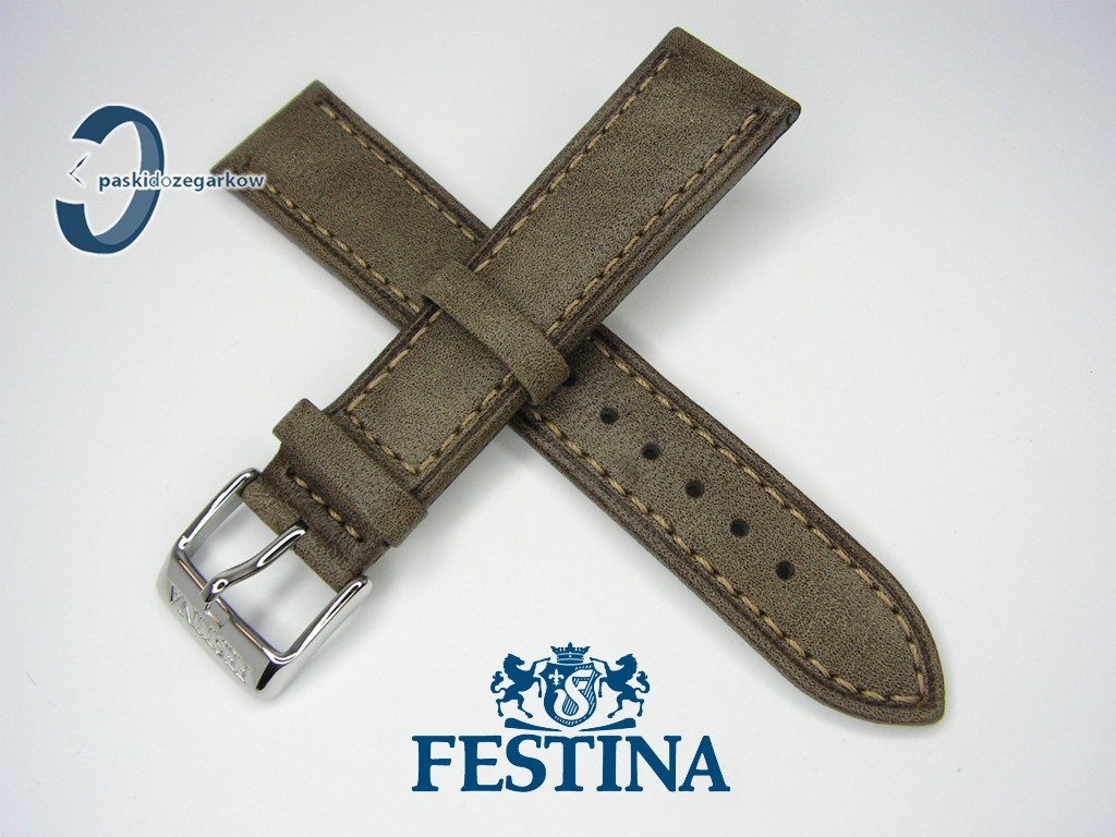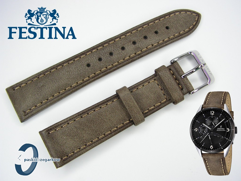 Oryginalny pasek do zegarka marki Festina F16848 skórzany w kolorze brązowym w rozmiarze 21 mm, gładki, przeszyty jaśniejszą nicią, sprzączka stalowa z napisem Festina, zapinany na telekopy, pasuje do innych zegarków z rozstawem koperty 21 mm.