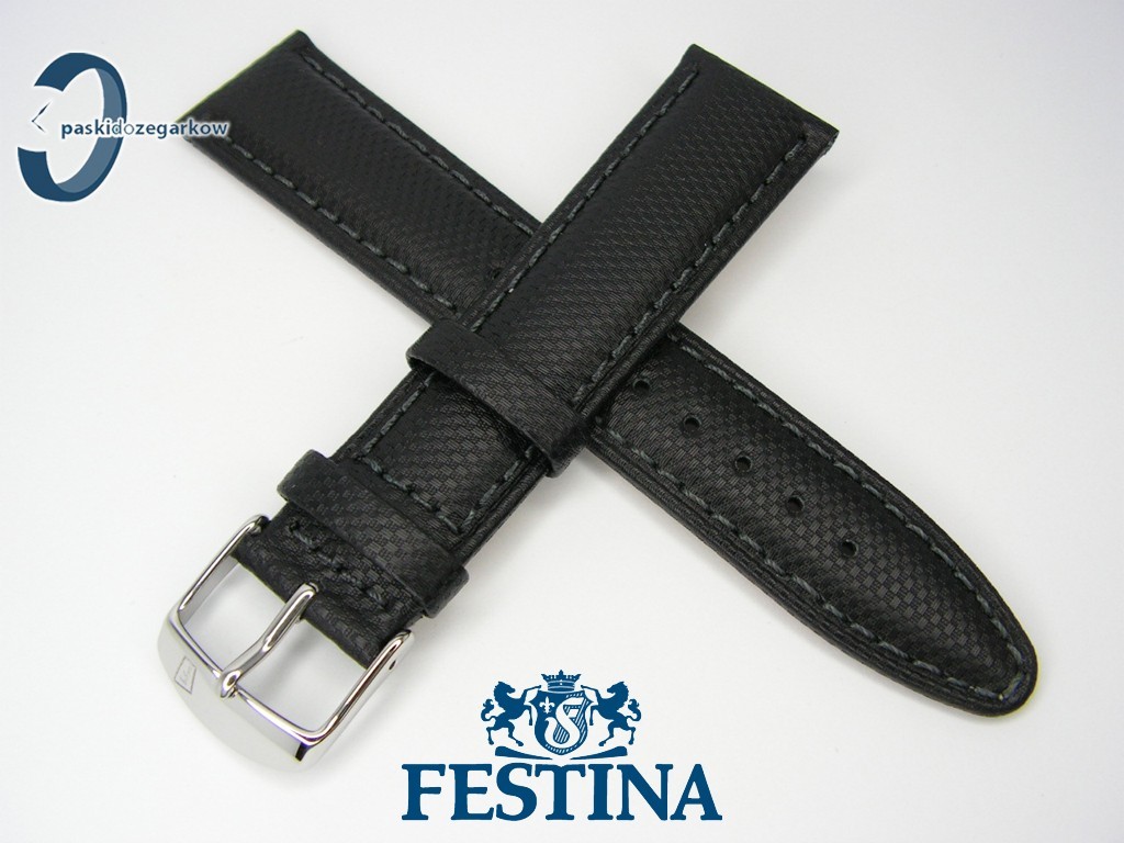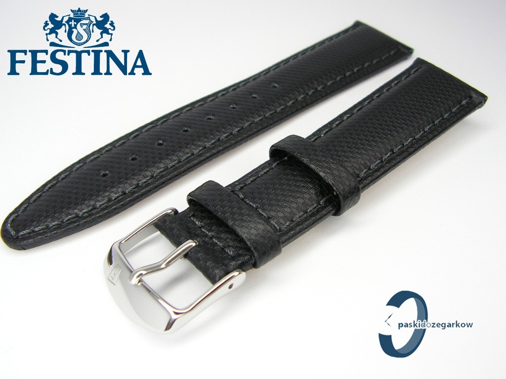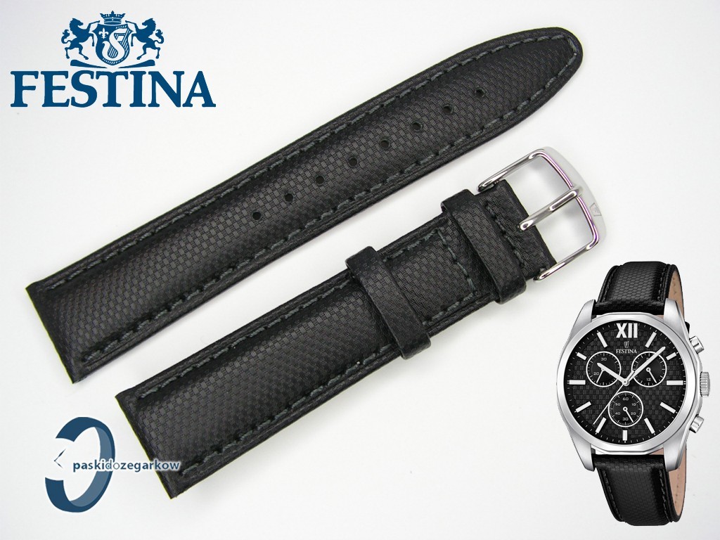Oryginalny pasek do zegarka marki Festina F16860 czarny skórzany,rozmiar 21 mm, sprzączka stalowa z logo Festina, zapinany na telekopy, przeszty czarną nicią, pasuje do innych zegarków z rozstawem koperty 21 mm, na pasku faktura.