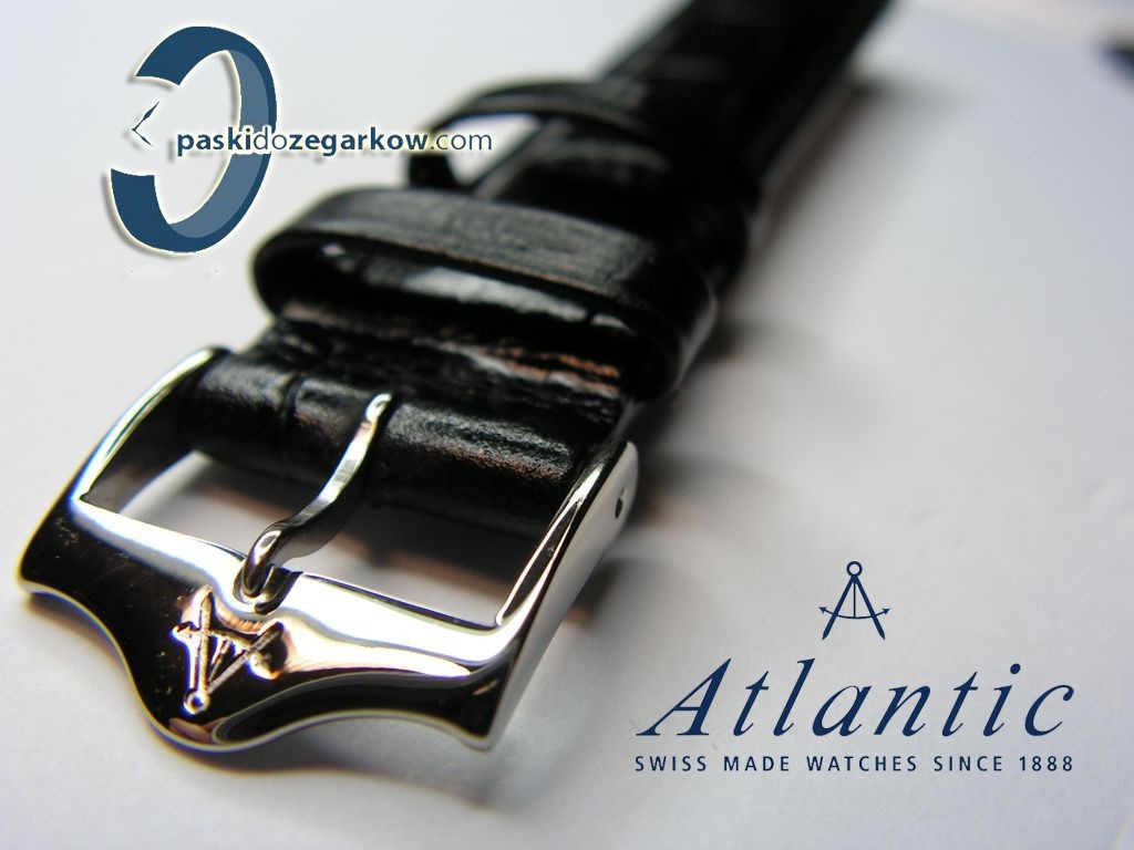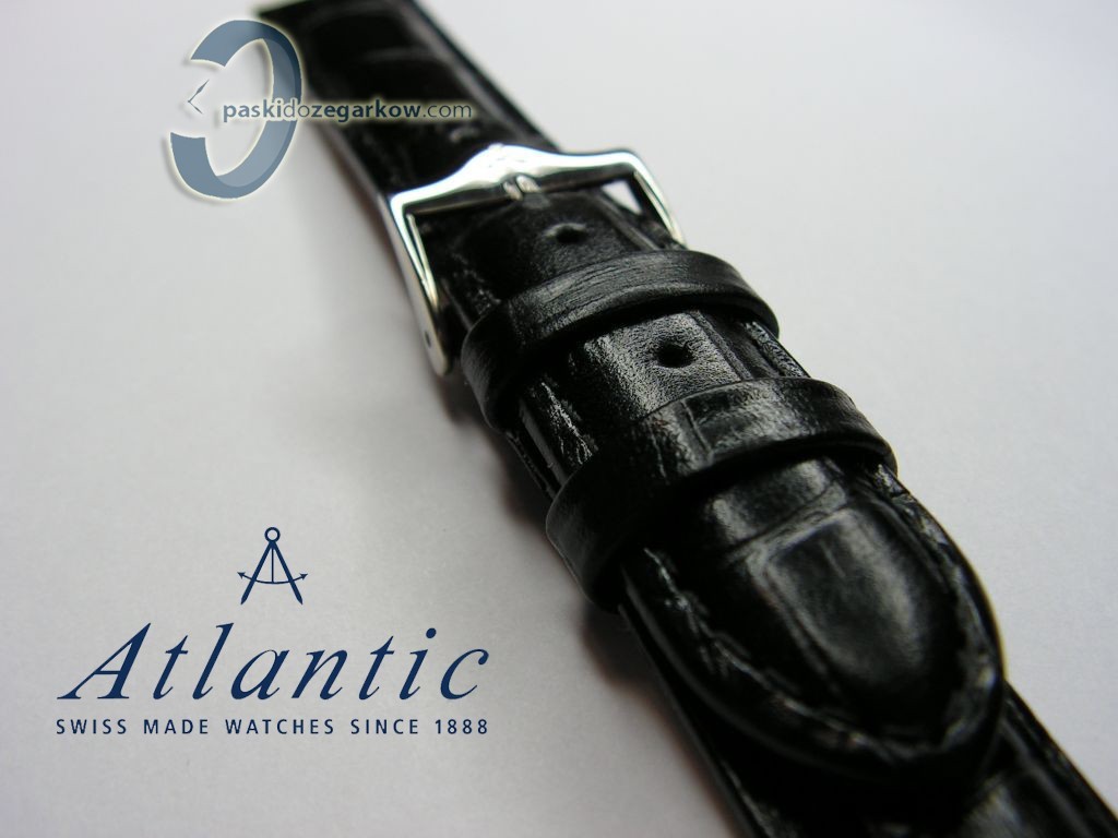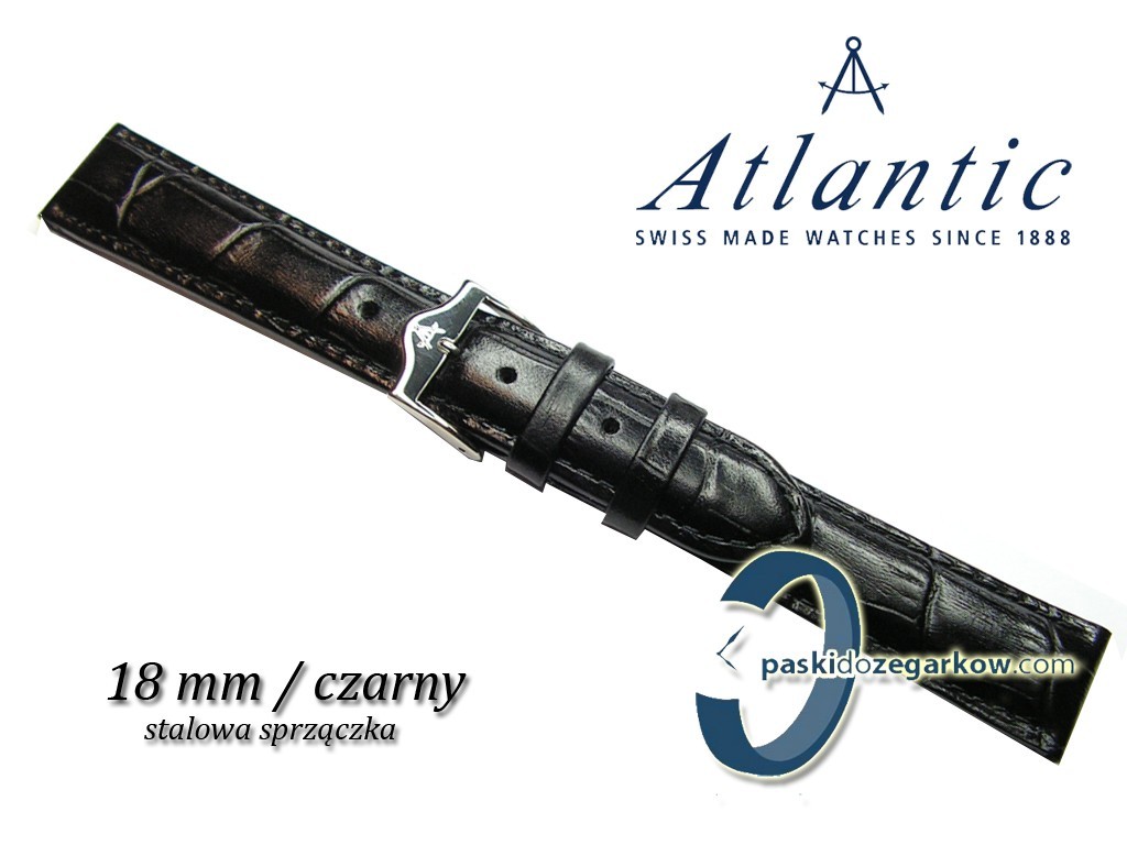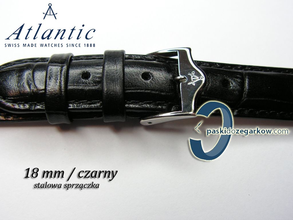 Oryginalny skórzany pasek do zegarka marki Atlantic w rozmiarze 18 mm, kolor czarny, stalowa sprzączka w kolorze srebrnym, na pasku tłoczony wzor aligatora.