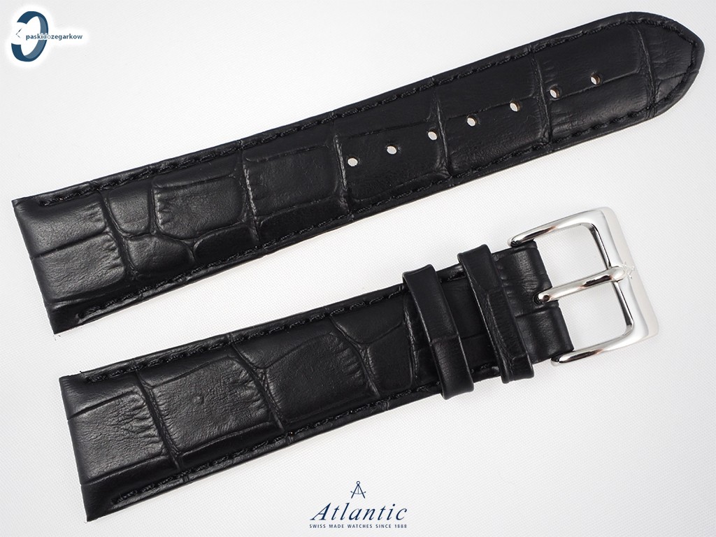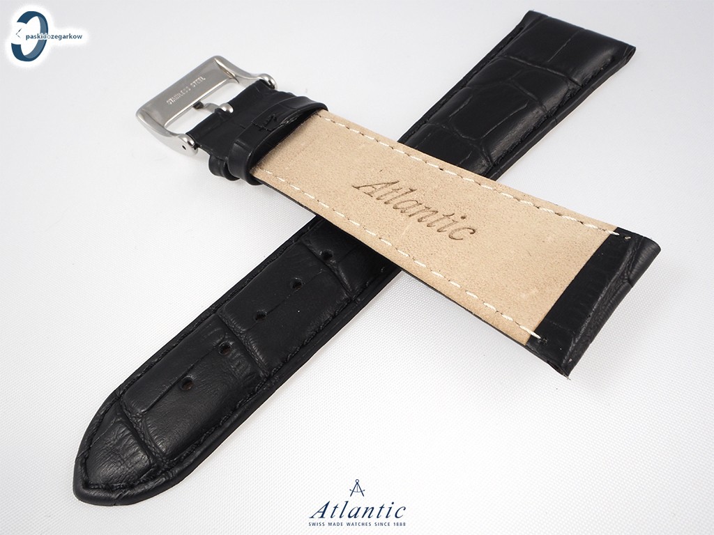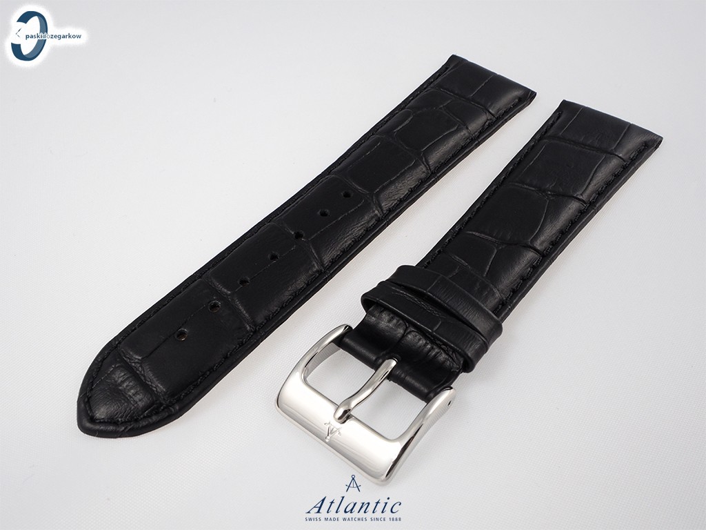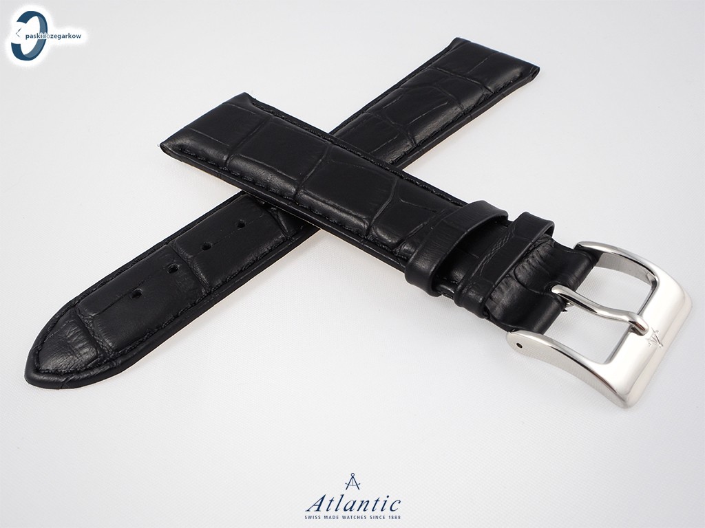 Oryginalny pasek do zegarka Atlantic wykonany ze skóry w kolorze czarnym, tłoczony wzór aligatora, przeszyty czarną nicią, sprzączka wykonana ze stali nierdzewnej w kolorze srebrnym.