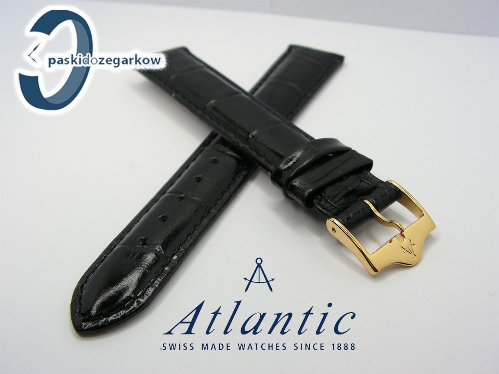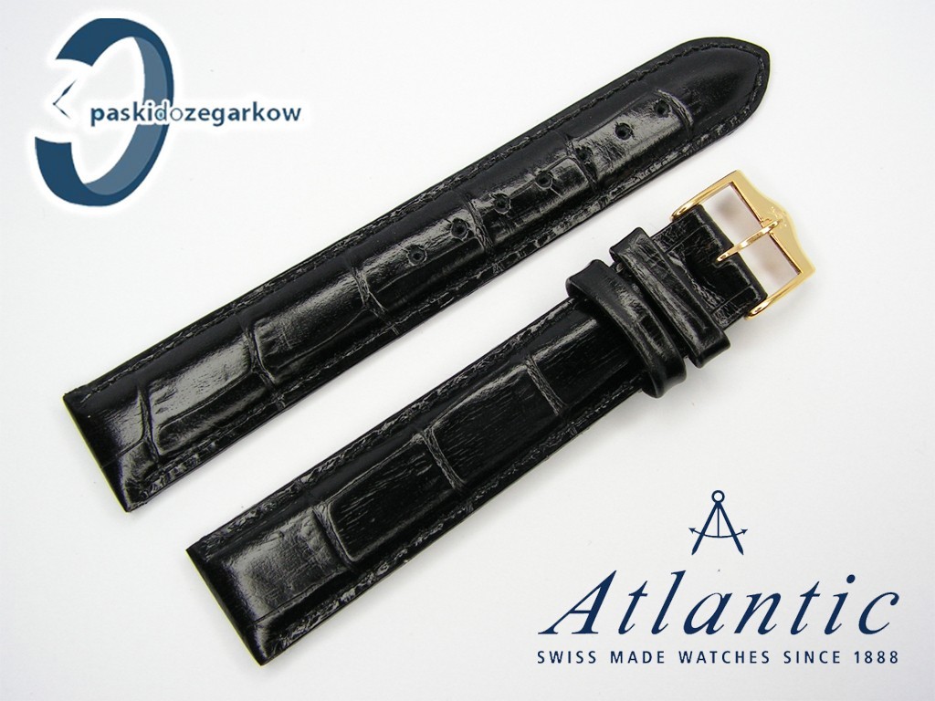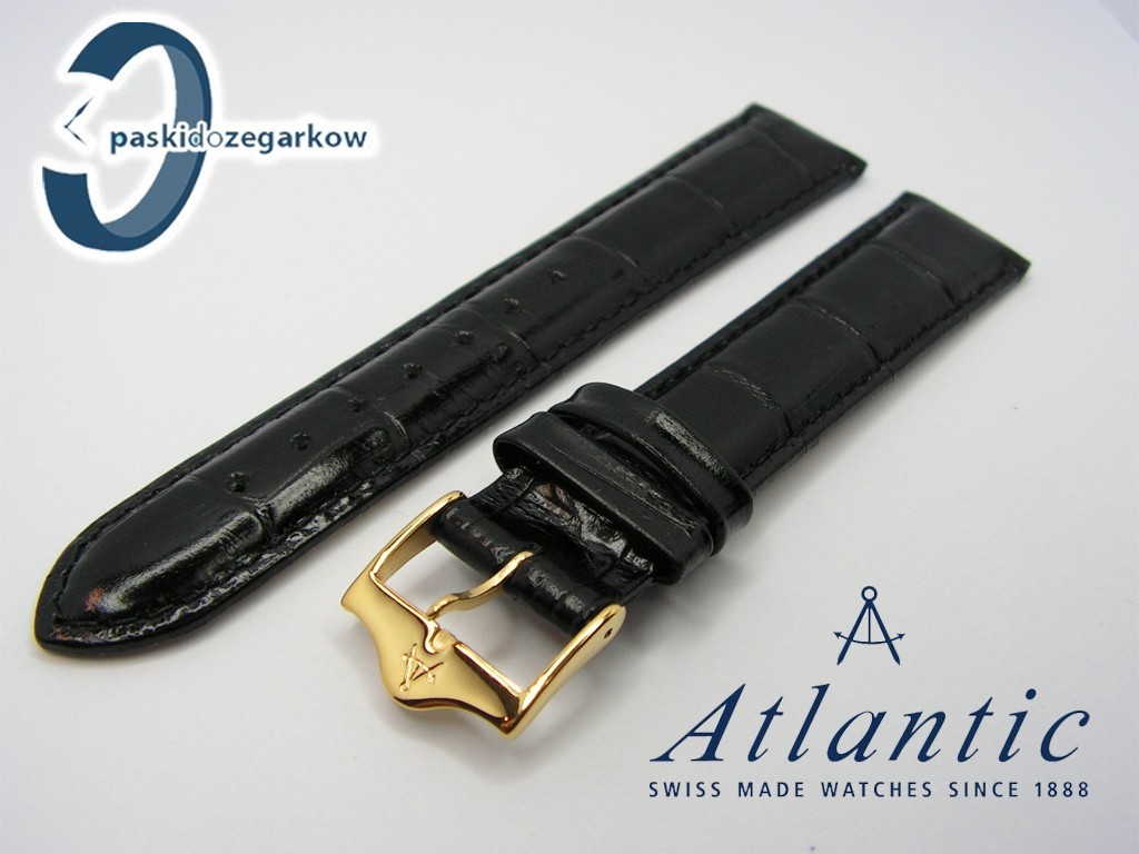 Oryginalny pasek do zegarka Atlantic wykonany z dobrej jakości skóry naturalnej, w kolorze czarnym, z połyskiem, na pasku wytłoczony wzór aligatora, sprzączka stalowa w kolorze złotym z wybitym logo Atlantic, przeszycie w kolorze paska, w rozmiarze 18 mm, a zatem pasuje do innych zegarków z rozstawem koperty 18 mm.