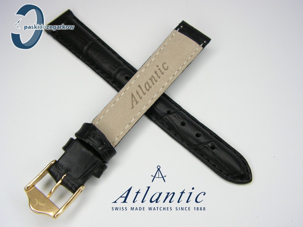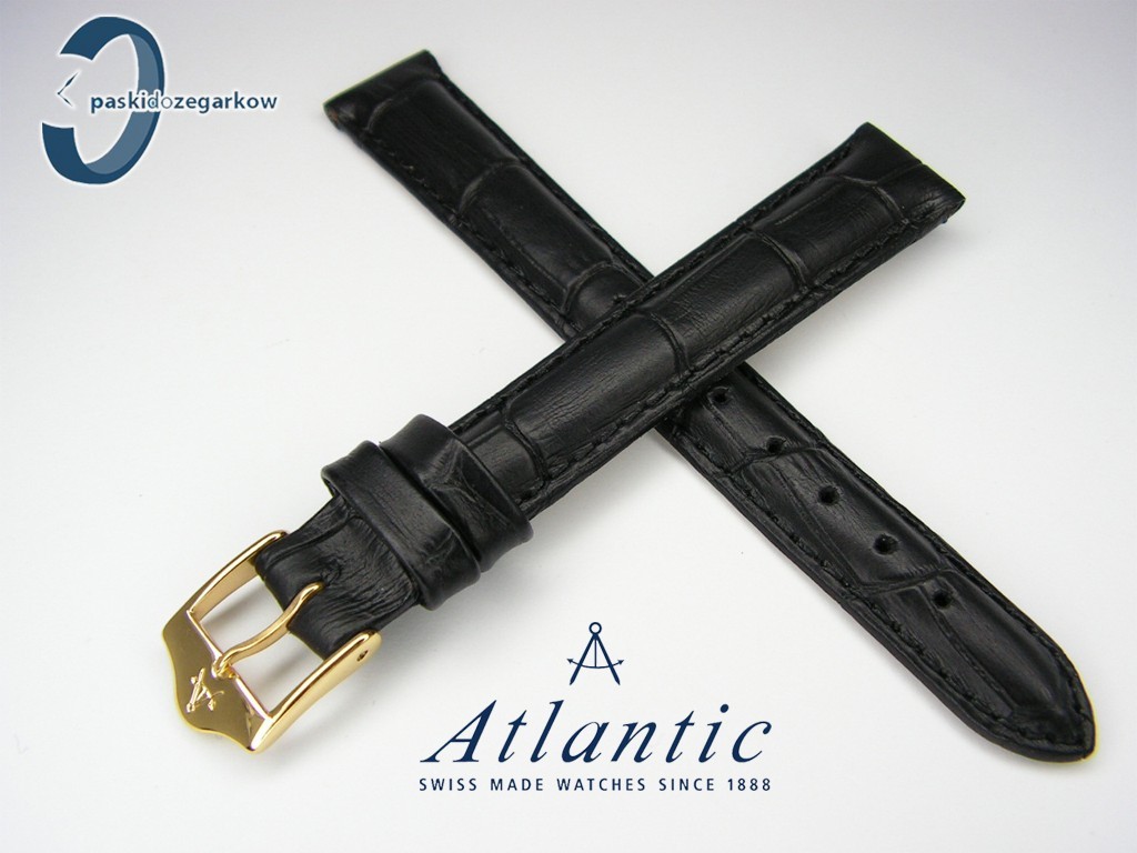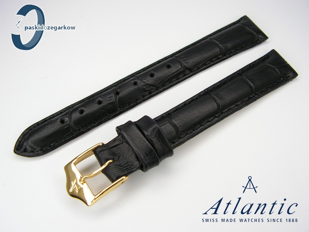 Oryginalny pasek do zegarka marki Atlantic skórzany, kolor czarny, na pasku wytłoczony wzór aligatora, szerokość paska 14 mm, sprzączka stalowa w kolorze złotym z logo Atlantic.