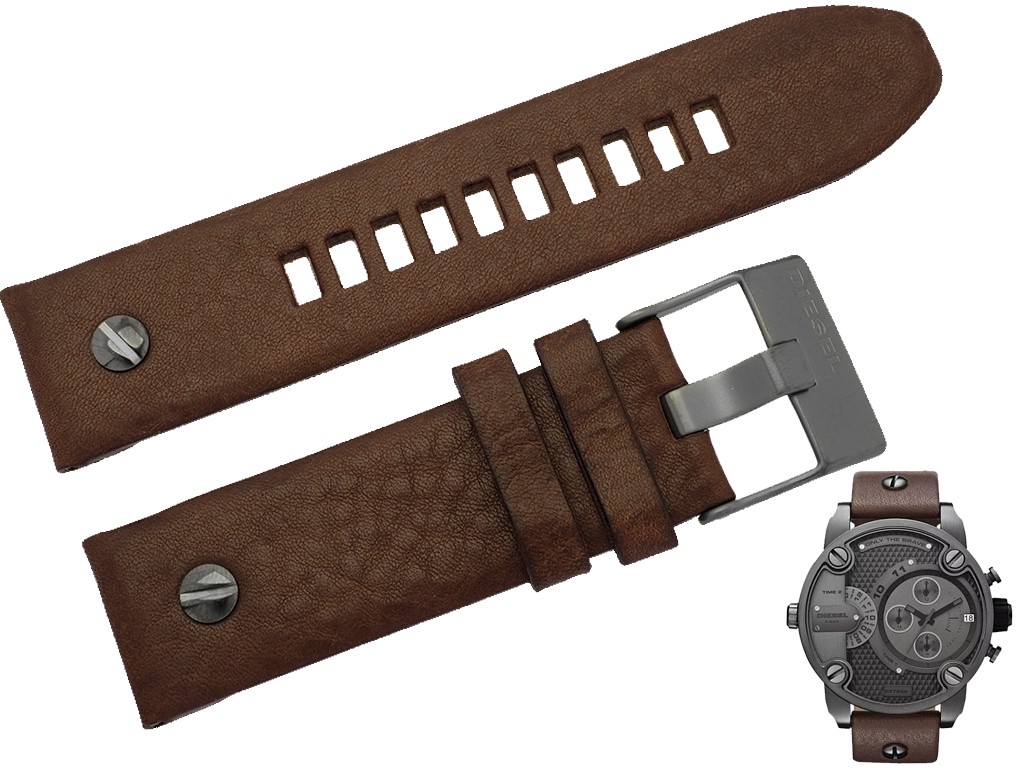 Oryginalny pasek do zegarka marki Diesel do modelu DZ7258, wykonany ze skóry naturalnej w kolorze ciemny brąz, bez przeszycia, sprzączka wykonana ze stali nierdzewnej w kolorze szarym matowym z napisem Diesel. Na pasku ozdobne ćwieki w kolorze szarym.