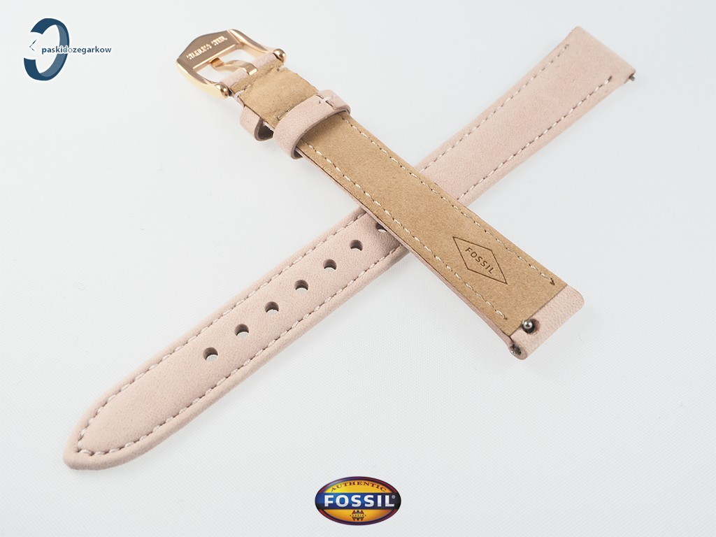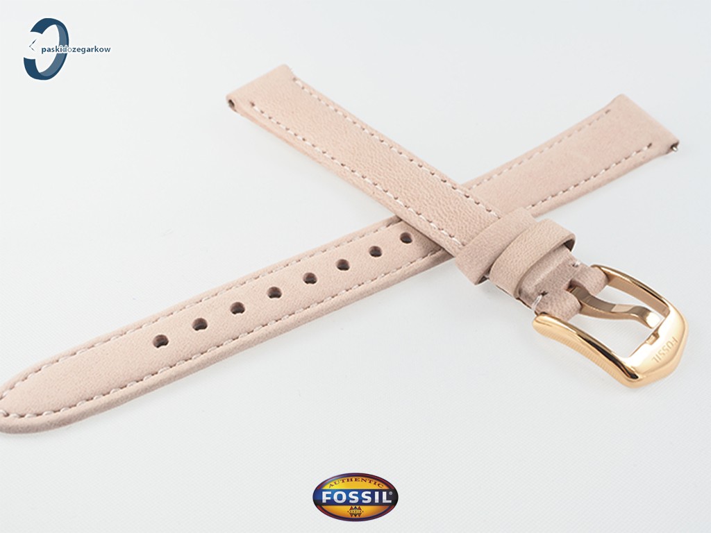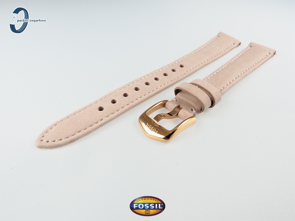 Oryginalny pasek do zegarka Fossil do modelu ES4303 skórzany, w kolorze pudrowy róż, gładki, przeszyty, matowy, sprzączka paska wykonana ze stali nierdzewnej w kolorze różowe złoto.