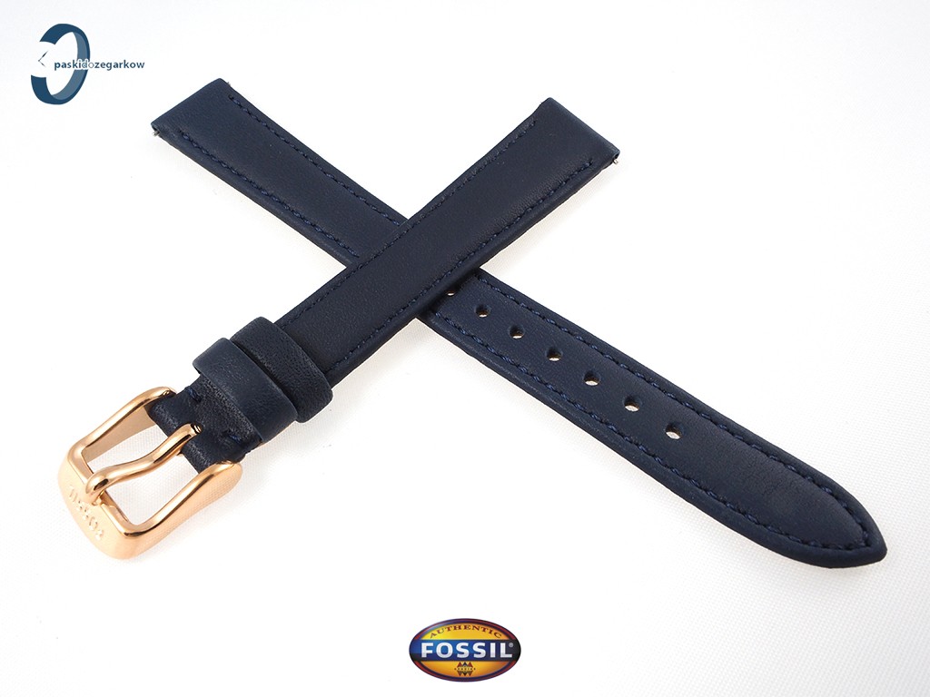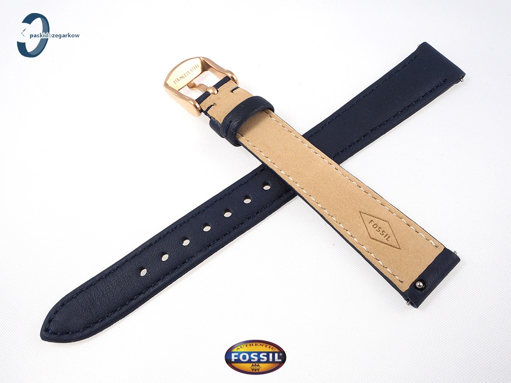 Oryginalny pasek do zegarka marki Fossil Jacqueline do modelu ES3843, wykonany ze skóry naturalnej w kolorze granatowym, gładki, matowy, sprzączka wykonana ze stali nierdzewnej w kolorze różowego złota.